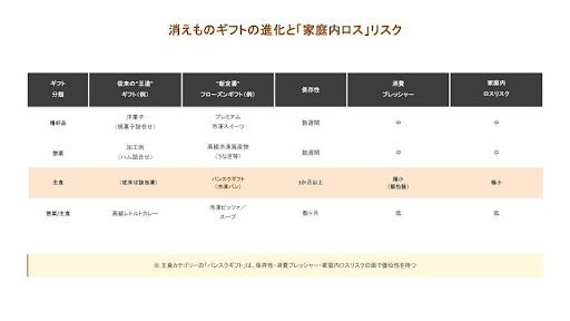 節約志向が進む中、「失敗したくない」心理から、相手に気を遣わせず確実に消費してもらえる「実用的な消えもの」への回帰が進んでいます。