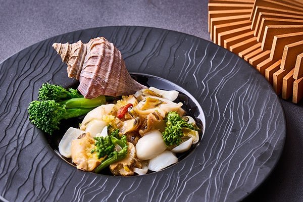 富山県産のつぶ貝を、菜の花と百合根とともに、岩塩をベースにした塩ダレで炒め、香り高い刻み柚子を加えて仕上げました。つぶ貝の弾むような食感に、菜の花のほろ苦さと柚子の爽やかな香りが重なり、食材の持ち味を引き立てます。