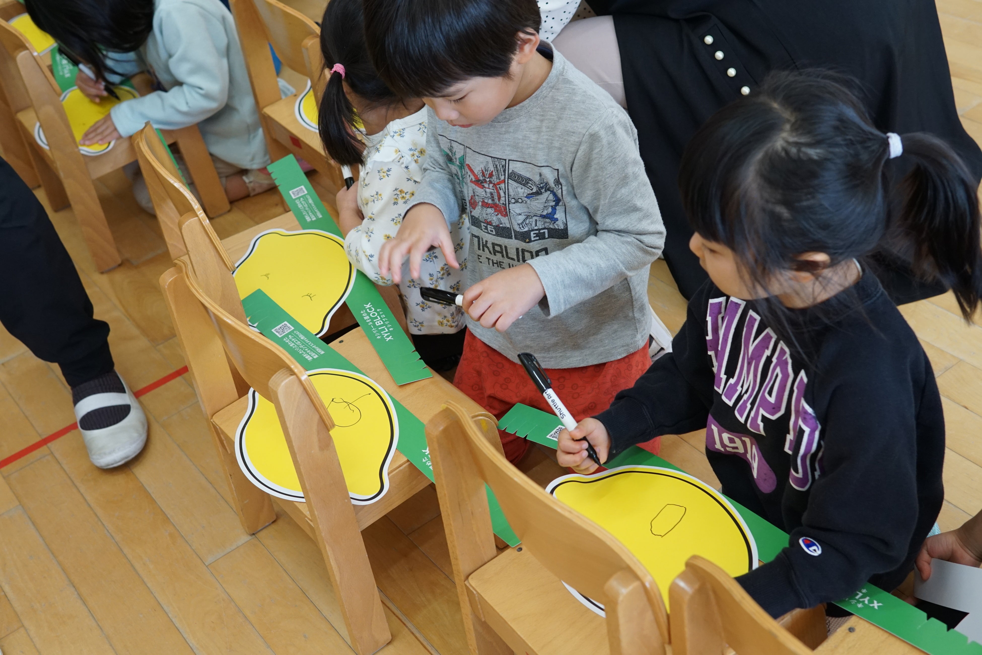 次に、レモンの形をした紙製のかんむりに、油性ペンで自由にデコレーション 。みんな真剣な顔でデザインし、世界に一つだけの「レモンちゃんかんむり」を完成させました。完成したかんむりをかぶって、気分はもうレモンちゃんフレンズ!
