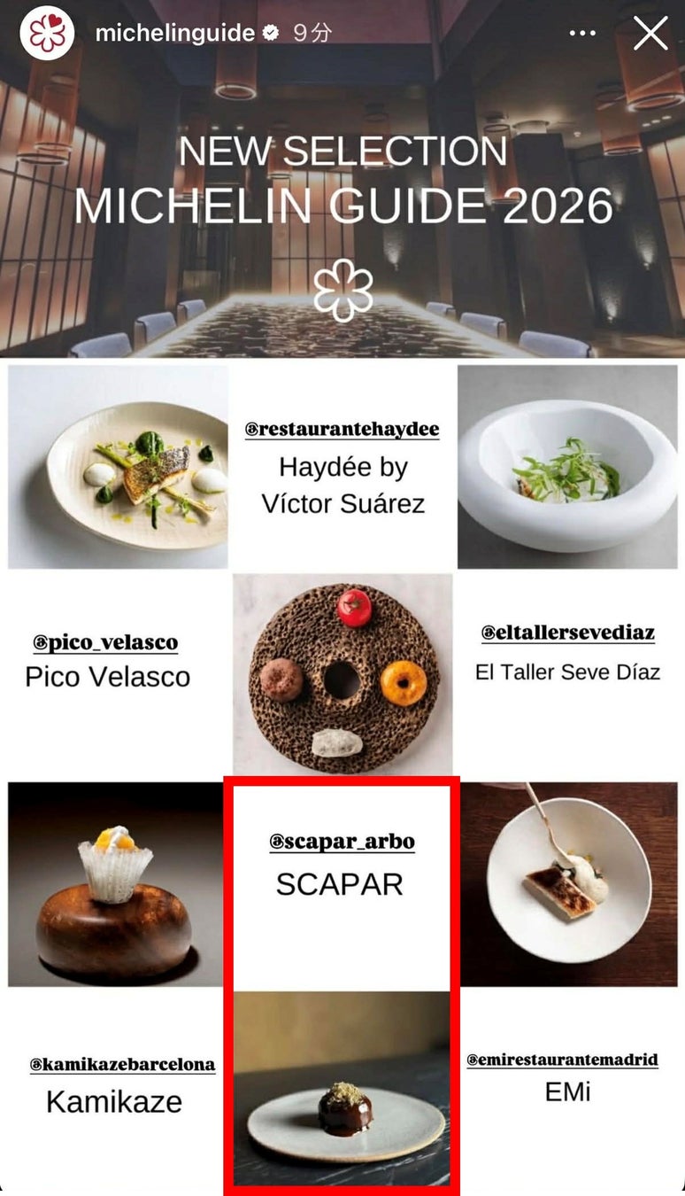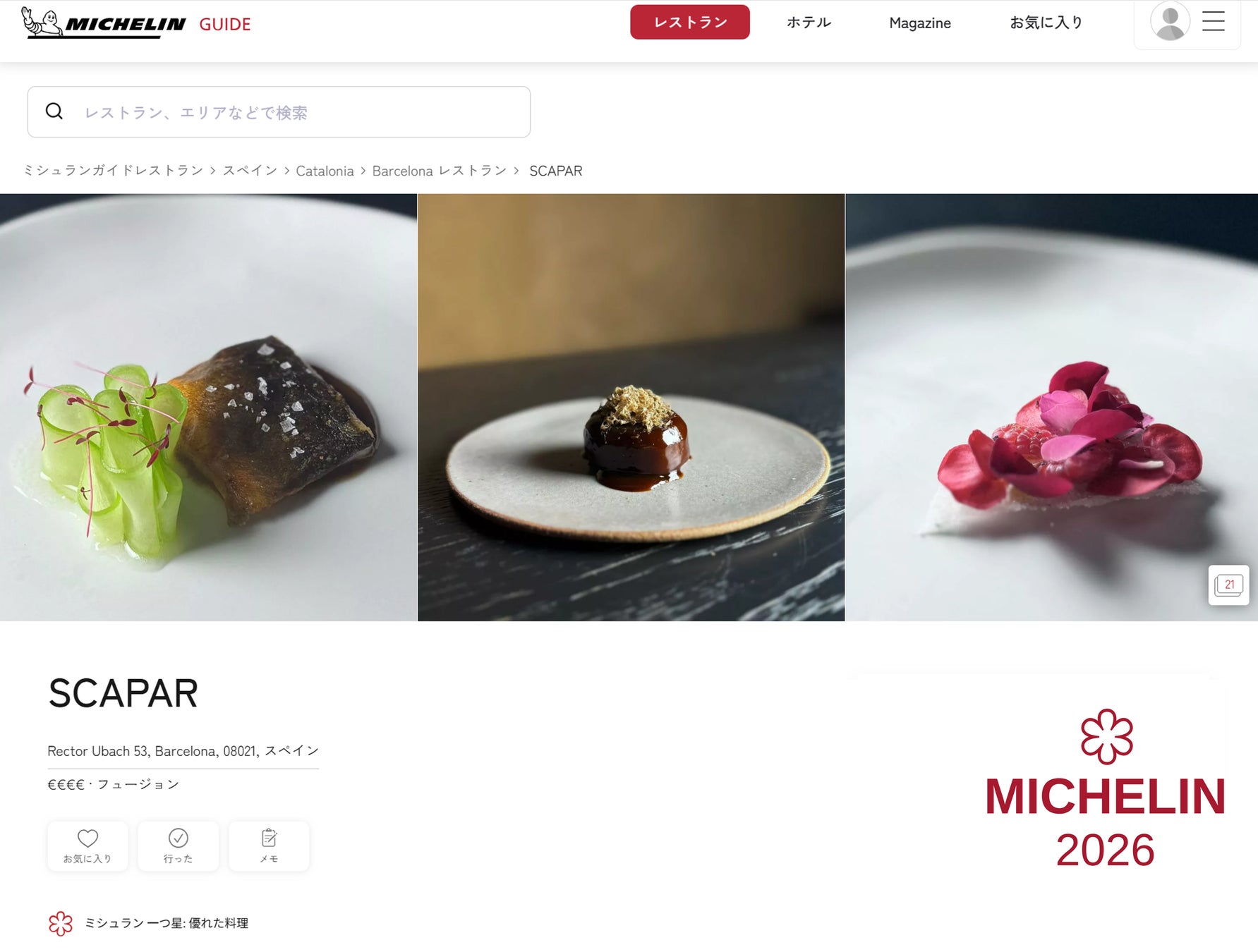2025年11月25日、スペイン・マラガで開催されたミシュランガイド2026 スペイン版 表彰式において、バルセロナのレストラン 『SCAPAR(エスカパール)』 が一つ星を獲得しました。