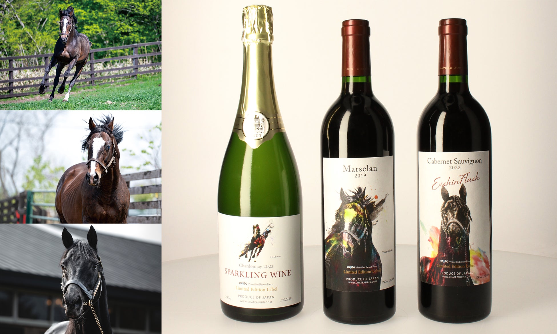 国内トップクラスの引退馬が余生を過ごす「ヴェルサイユリゾートファーム」の人気馬たちがワインに!午年にシャトージュンから名馬をイメージした味わいの特別なワインがオリジナルラベルで登場