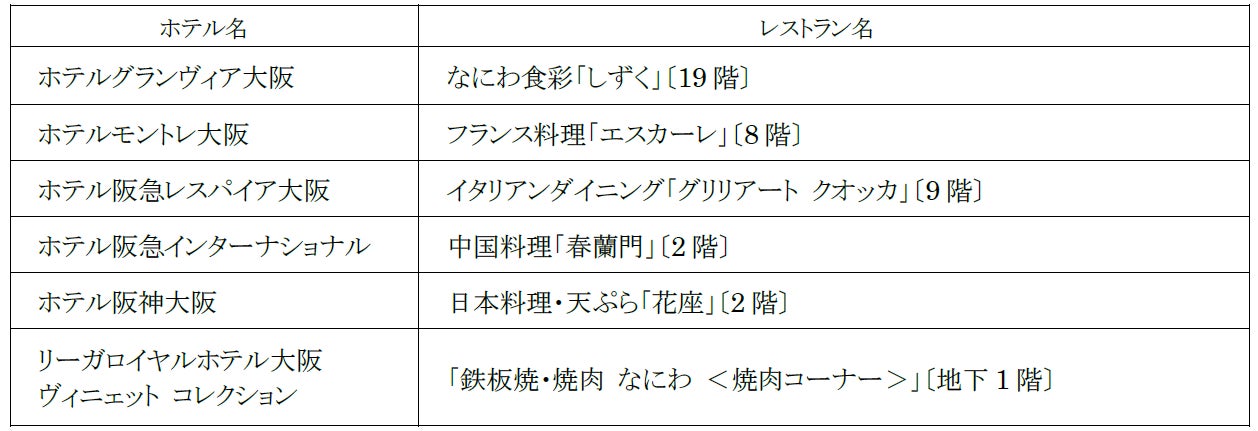 【参画ホテル】 ホテルグランヴィア大阪、ホテルモントレ大阪、ホテル阪急レスパイア大阪、ホテル阪急インターナショナル、ホテル阪神大阪、リーガロイヤルホテル大阪 ヴィニェット コレクション(順不同)