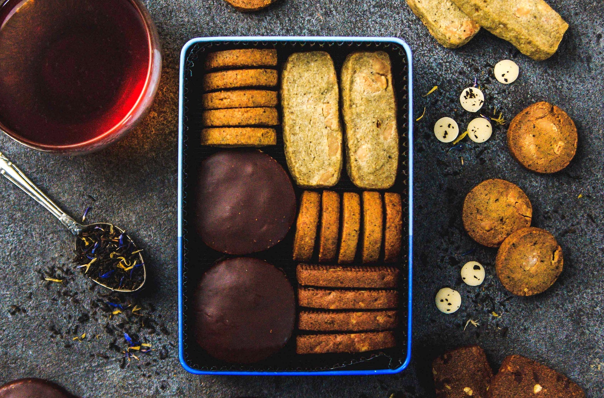 北海道産発酵バターや高品質チョコレートたっぷりなチョコ好きのための禁断のクッキー缶です。チョコだらけクッキー缶にアールグレイの香りを重ねると香り豊かな特別な味わいのクッキーを生み出せるのでは?というアイデアから生まれた、チョコたっぷり、アールグレイの香りが華やかなクッキー缶です。