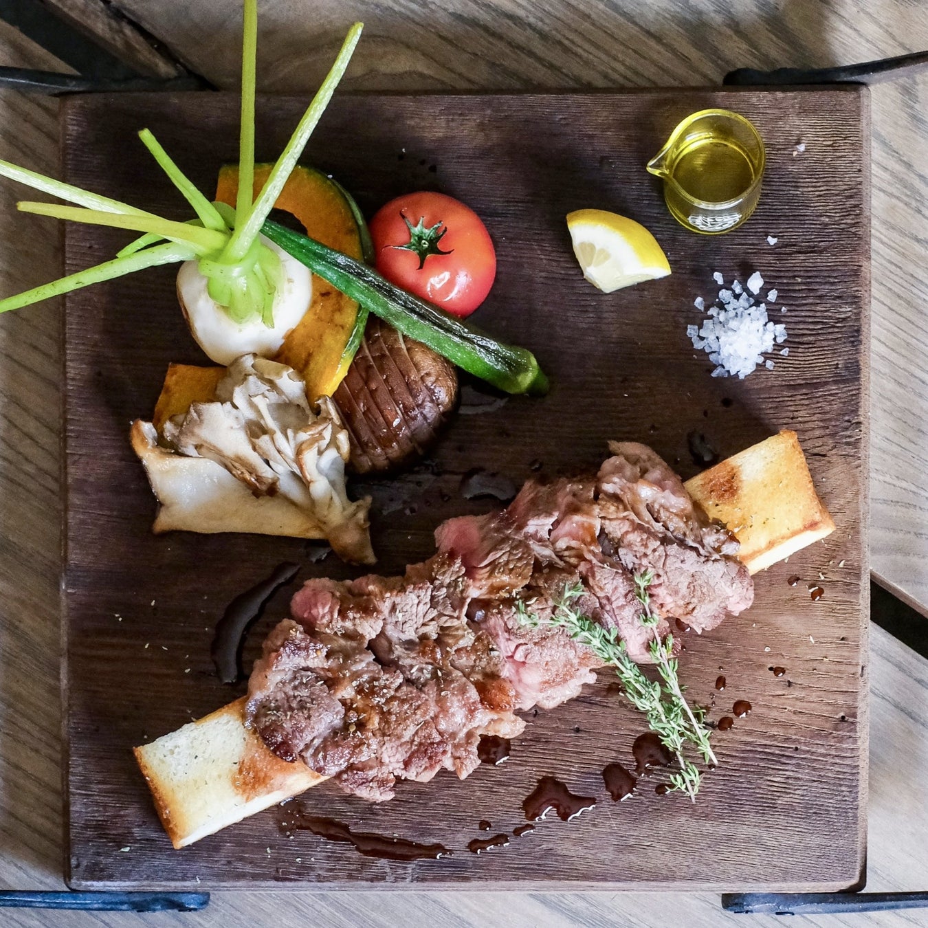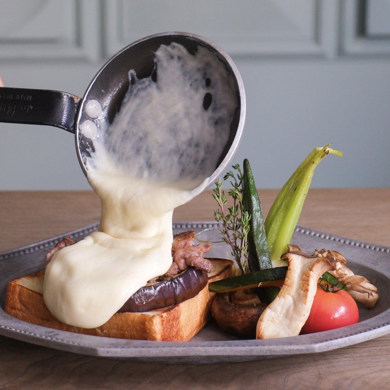 パフェの前におすすめのプレート。お腹の具合やその時の気分によりアレンジ⾃在です。5-6種類の季節野菜ステーキをベースとし、お⾁やパンのステーキ、お席でおかけする特性チーズソースの組み合わせをご⾃由にお楽しみください。特製のエシャロットオイルを添えます。