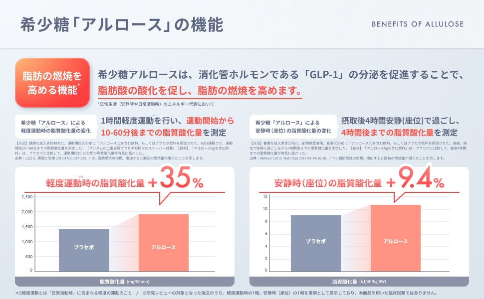 (*1) 日常生活(安静時や日常活動時)のエネルギー代謝において、脂肪の燃焼を高める機能があることが報告されているアルロースの研究報告