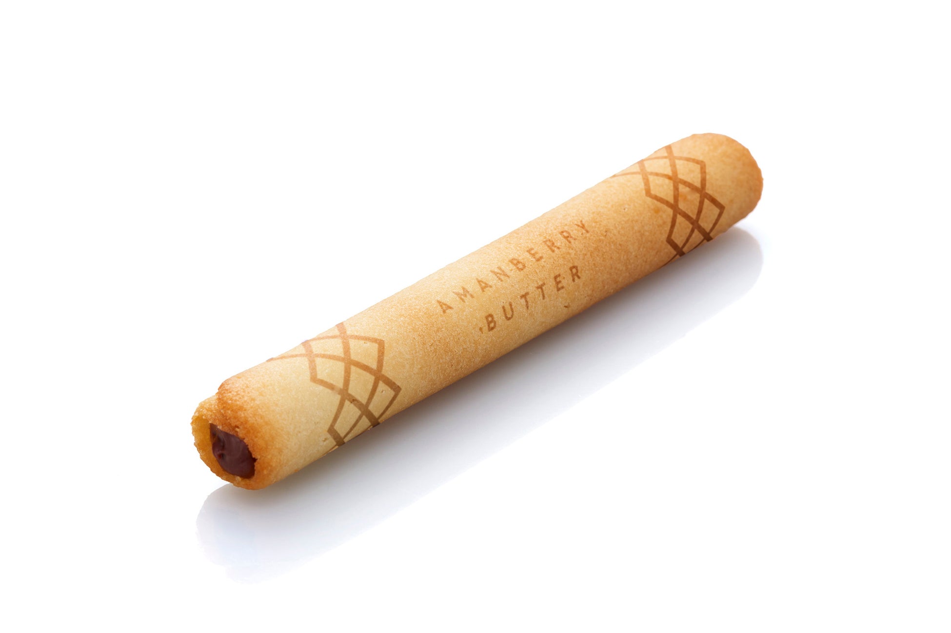 「アマンベリーバター」は、あまおうチョコ※をバターが香るラングドシャで包んだ新しいロール菓子です。チョコレートには、福岡が世界に誇るいちごの品種「あまおう」を使用し爽やかな果実の香りとバターの風味が豊かで、サクサクの食感を実現しました。