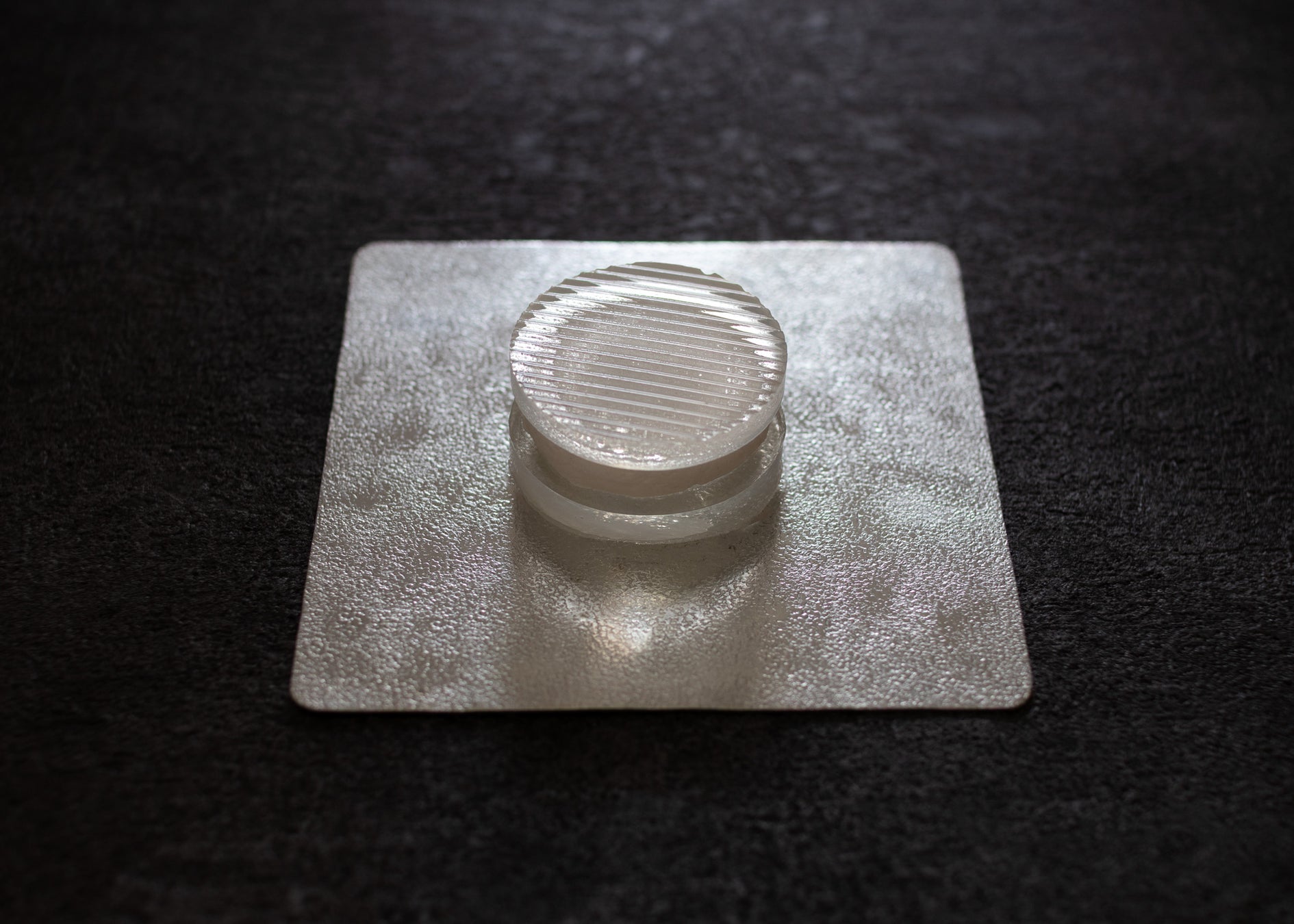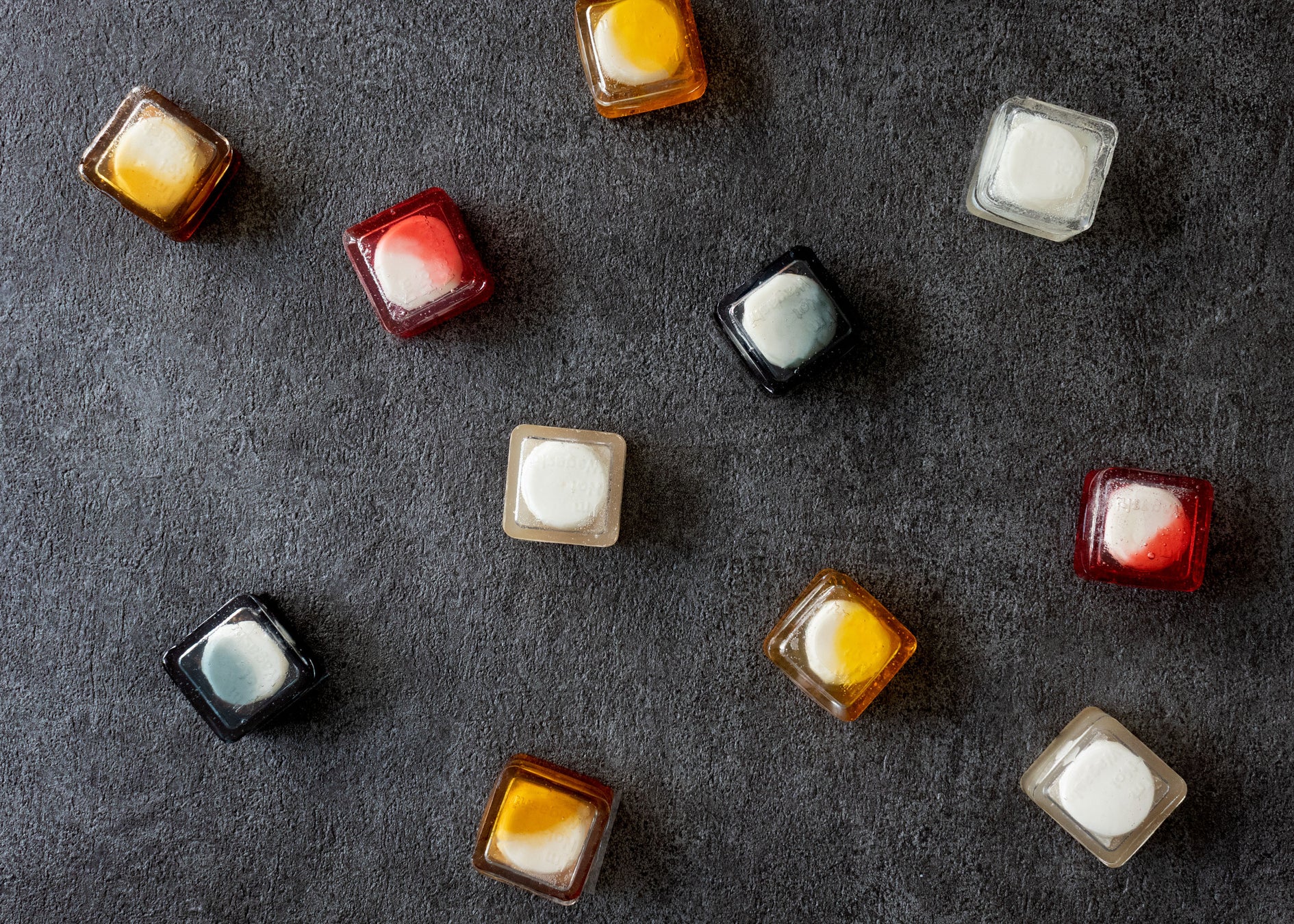 「光の工芸品」として話題沸騰中の《秘宝》は、透明な琥珀羹(クリスタルコンテナ)にバター練り物を封じ込めた新しい形のバターサンドです。その緻密なデザインは3DCADを用いて設計され、宝石のブリリアントカットを模した120個のメレダイヤのようなカッティングが光を反射します。