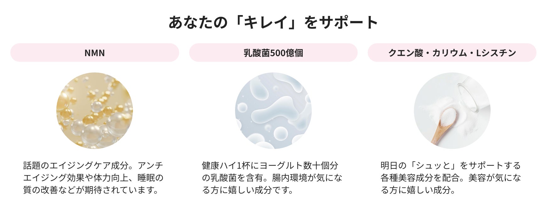 お酒でもノンアルでも提供OK!糖類・プリン体ゼロの美容健康割材で、乳酸菌500億個や難消化性デキストリン、NMNなどを配合し、女性の注文率・リピート率も高い!導入カンタンで既に80店舗導入済み!