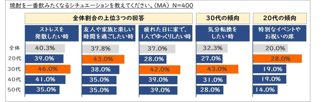 20代は「友人や家族と楽しい時間を過ごしたい時」に焼酎を飲みたくなる傾向。