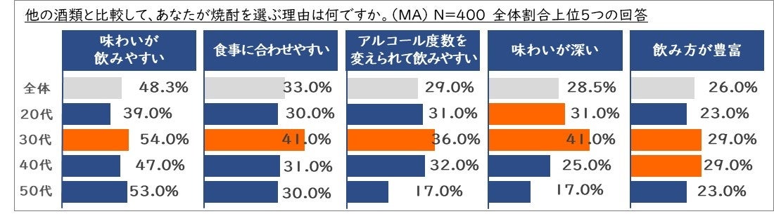 特に20代・30代では「味わいが深い」との回答も多く、焼酎の味わいそのものが高く評価されていることが分かります。さらに30代では「アルコール度数を変えられて飲みやすい」、「飲み方が豊富」といった理由を挙げる人の割合も高く、焼酎の飲み方の柔軟性が支持されていることがうかがえます。