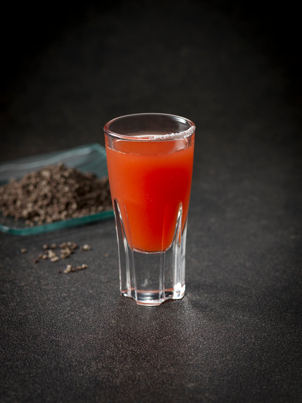1.シューターグラス(又はショットグラス)の縁の一部をシークヮーサージュースで濡らし、雪塩を少しつける。