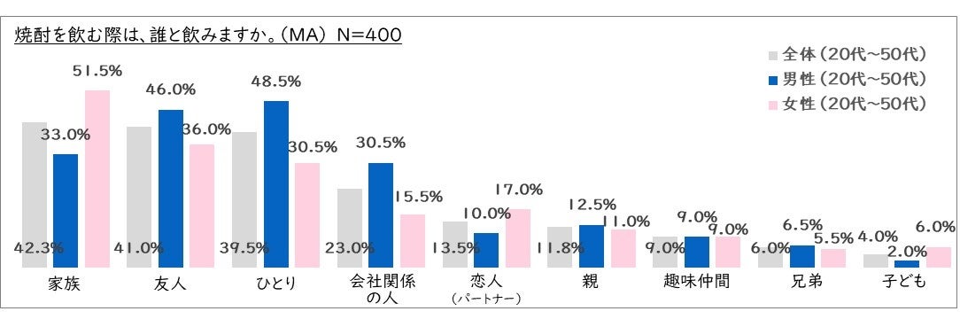 全体でみると「家族」、「友人」、「ひとり」で飲むことが多い結果に。ただし、女性は「家族」と飲むが51.5%で最も多く、男性は「ひとり」で飲むが48.5%と最多でした。男女間で飲酒スタイルに大きな違いが見られました。