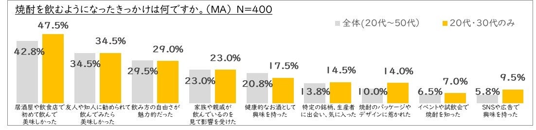 焼酎を飲むようになったきっかけは、「飲んでみたら美味しかった」が上位に。