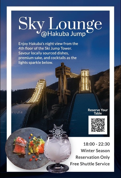 長野オリンピックの舞台である白馬ジャンプ競技場の展望フロアに、白馬初となるガストロバー『Sky Lounge @ Hakuba Jump』が12月20日(土)オープンします。ライトアップされたジャンプ台と白馬の夜景を望む特別な空間で、地産食材を活かしたガストロノミーとオリジナルカクテルをご堪能いただける、新しい夜の体験拠点です。会場へは送迎バスでアクセスでき、来場は事前予約制となります。