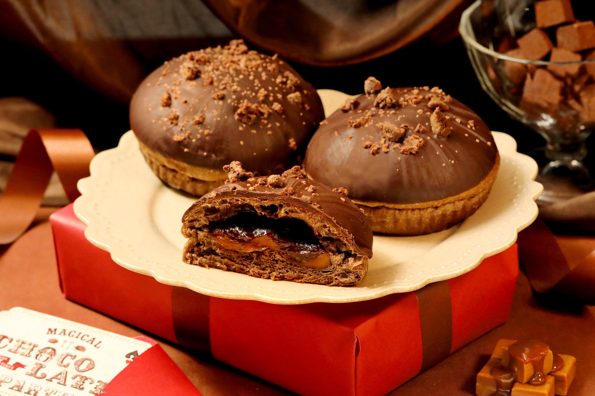 リームを包み、表面にキャラメル風味の上掛けチョコを重ねました。仕上げに口どけの良い