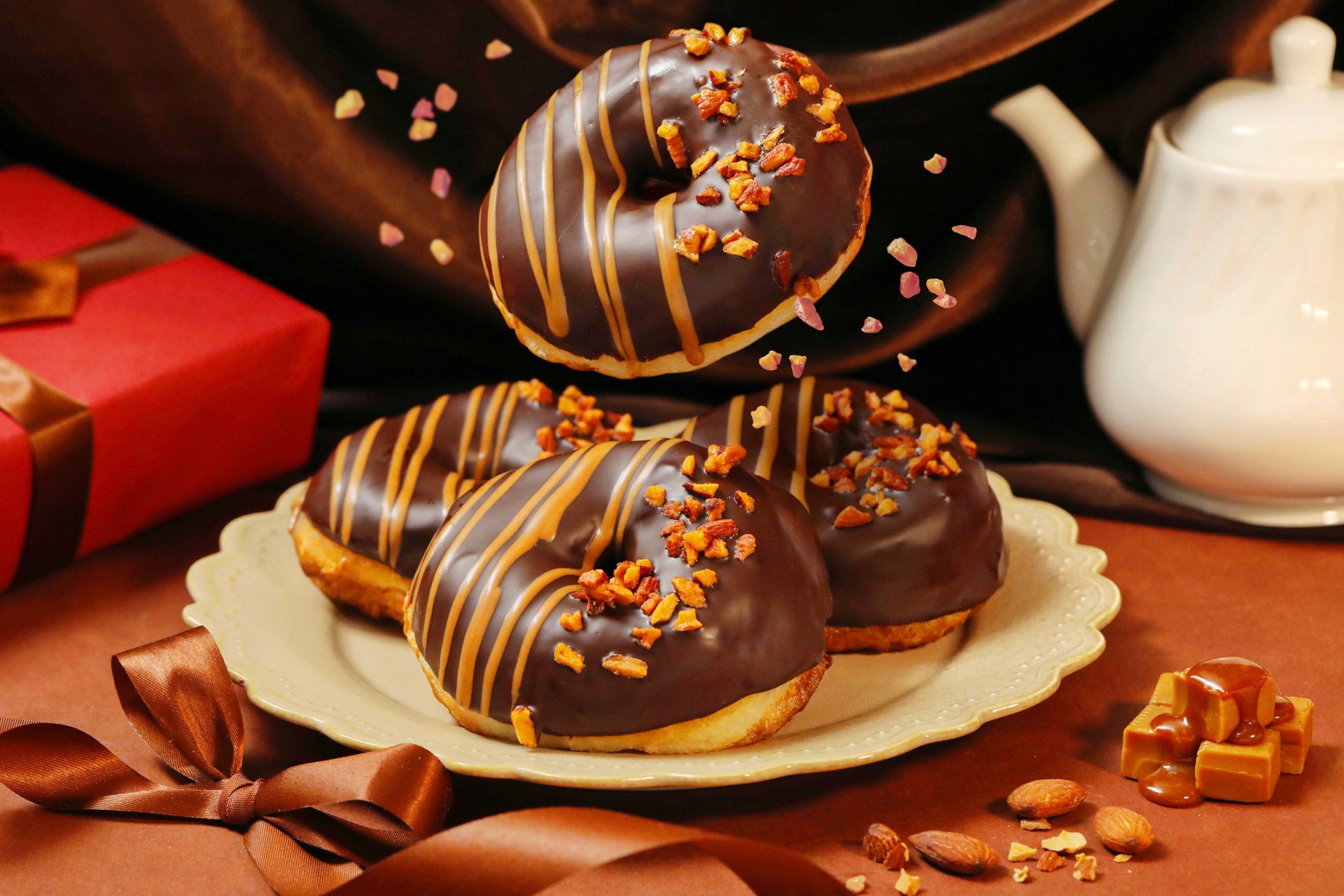 使用した“ふわっ、とろっ”食感の生ドーナツ生地に、チョコアイシングとキャラメルソース