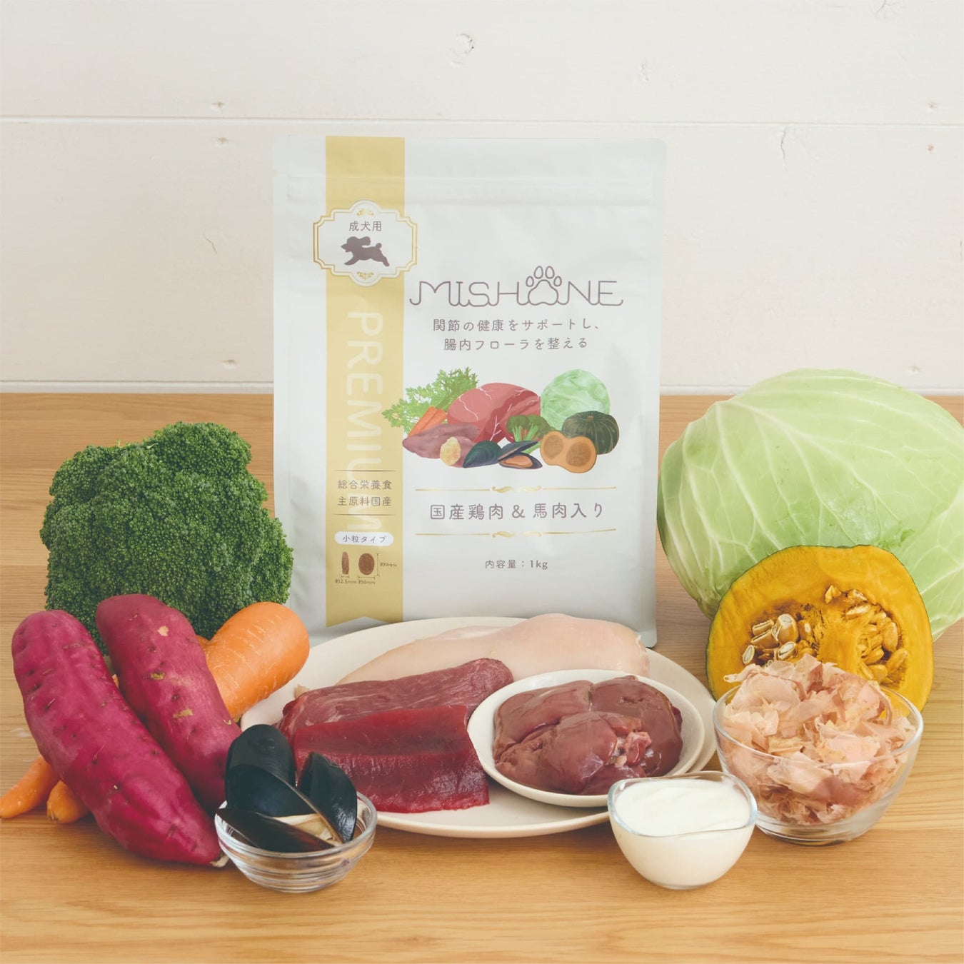 「国内製造シリーズ ミシュワンドッグフード」は、「ずっと寄り添うフードで“20歳を目指す”」というブランド理念のもと、日本国内の専門工場で人間の食品と同レベルで製造された高品質なドッグフードです。主原料には国産の鶏肉や馬肉、さらにはマグロやタラといった豊富な魚を使用し、保存料や着色料、香料といった余計な添加物を加えず、素材が持つ自然のおいしさをそのまま活かしています。