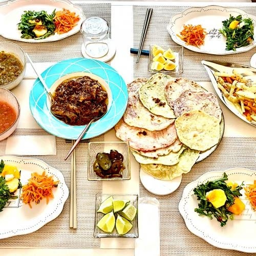 「タコス」は、食材をテーブルに並べ、各自が手を動かして仕上げていく、カスタムできる楽しさがあります。