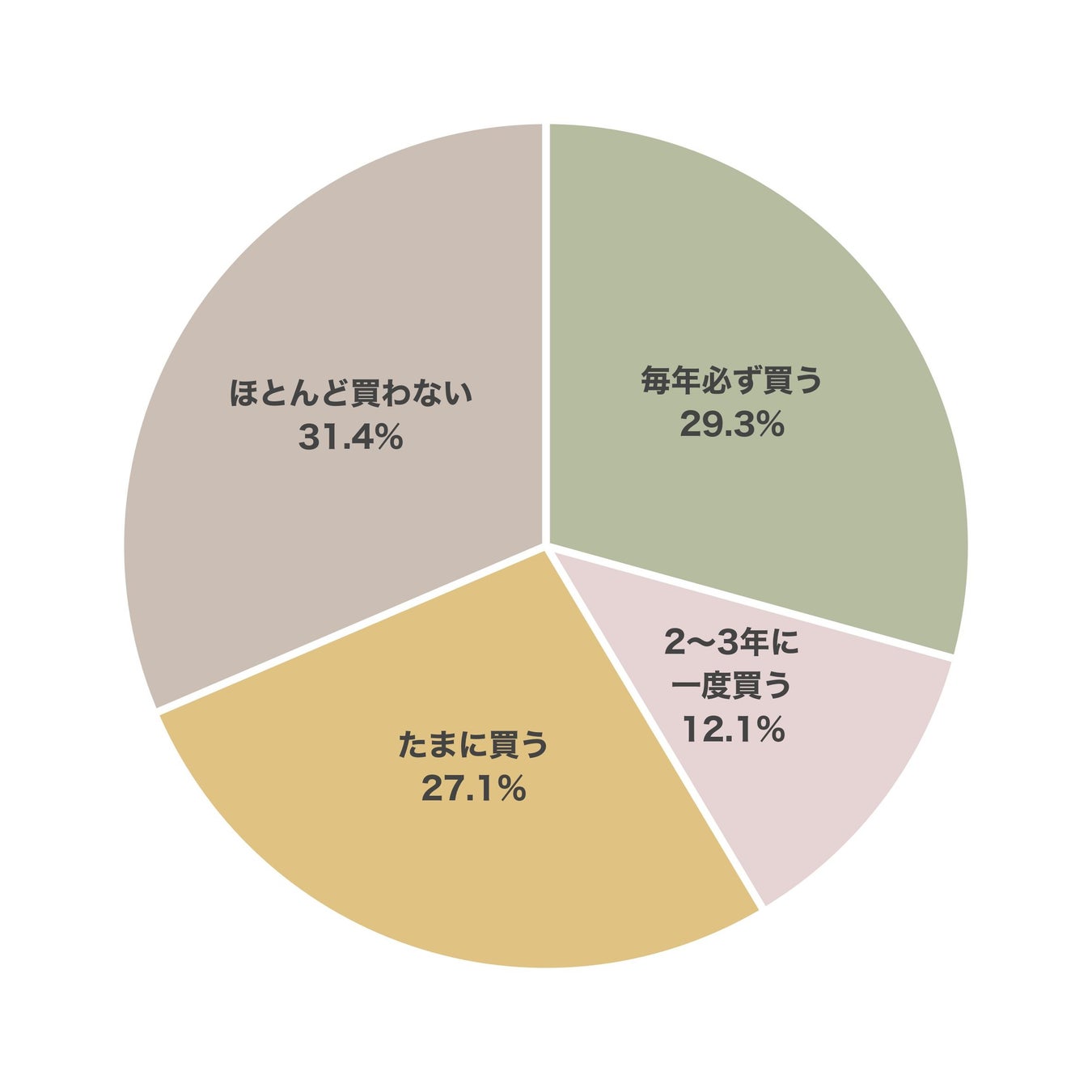 「ほとんど買わない」という回答が約3割(31.4%)見られた一方で、「毎年必ず買う(29.3%)」「たまに買う(27.1%)」を合わせると過半数が定期的な購入習慣を持っていることがわかりました。「2~3年に一度」を含めると、約7割が福袋購入経験者・関心層と言えます。