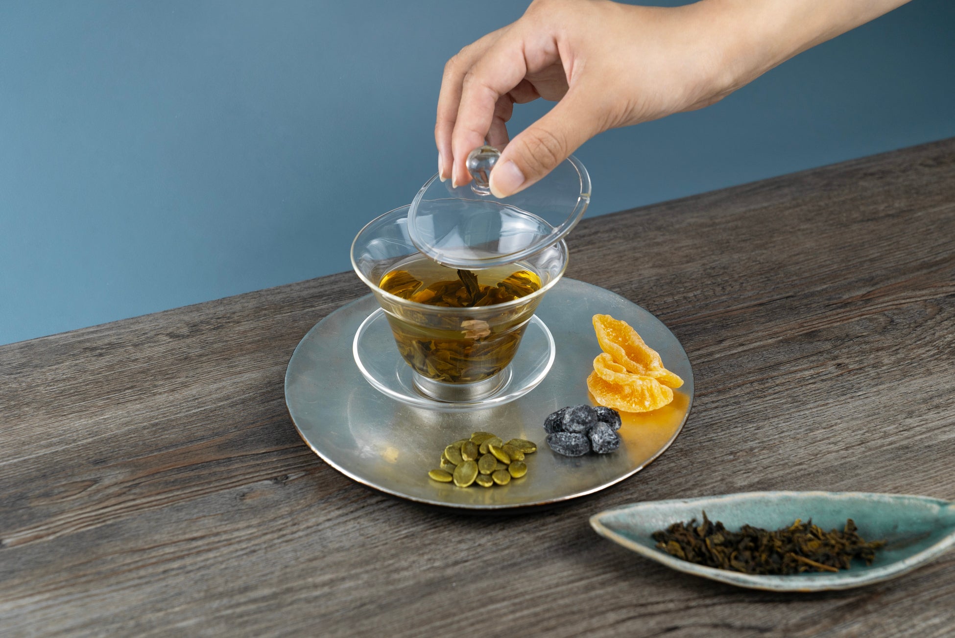 花茶がふわりと開く瞬間、八宝茶の色が溶け出すひととき。その美しさを“見て味わう”体験として日常に持ち帰れるように──。こうして、透明な耐熱ガラスで蓋碗をつくるというアイデアが形になりました。