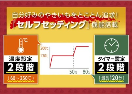 低温→高温など、焼き芋に適した工程を自分で設定可能。ホクホク系からねっとり系まで、品種にあわせて“理想の焼き上がり”を追求できます。