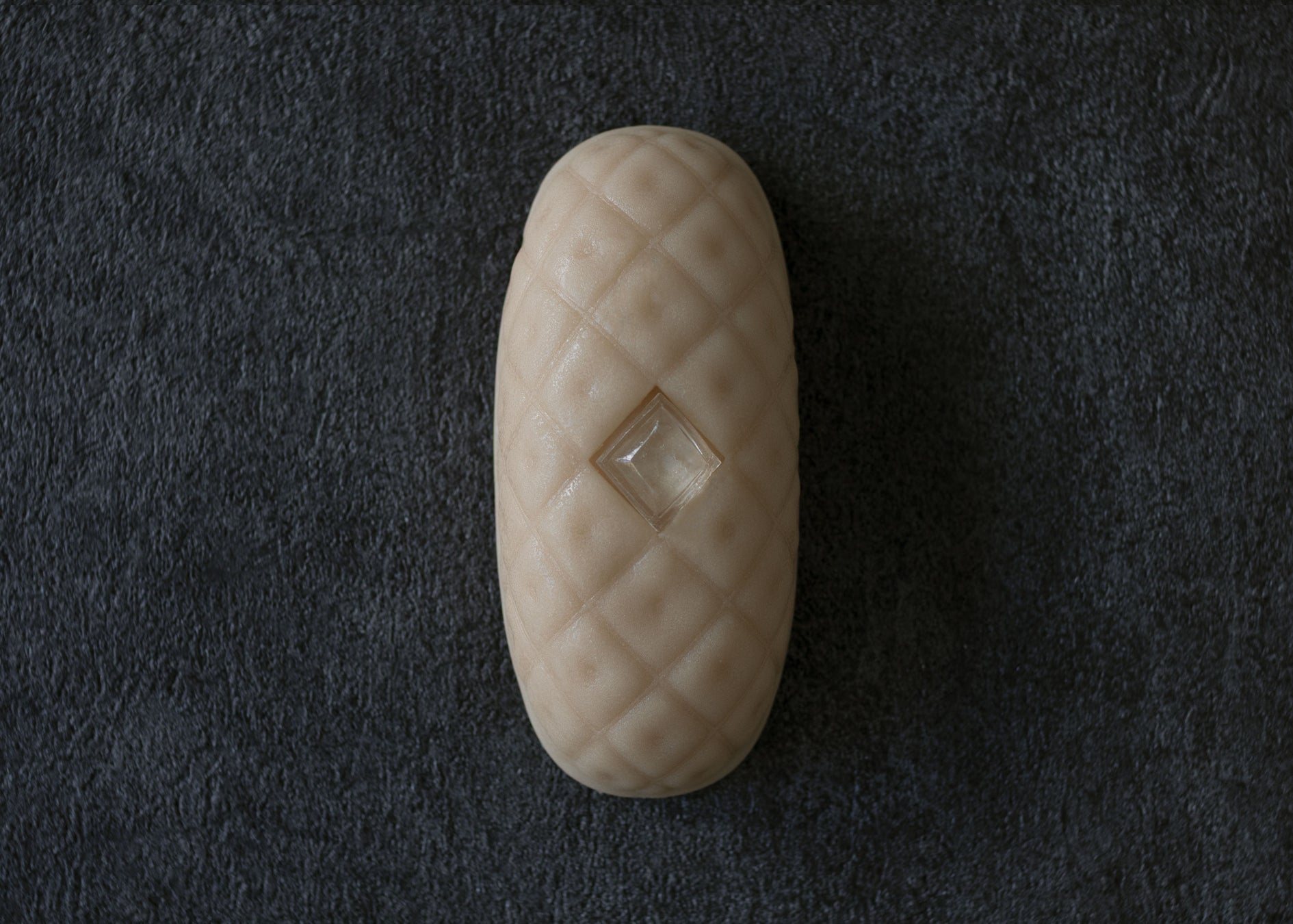 この【食べる美術工芸品】は、練り切りで再現した象牙のようなマットで密度の高いアイボリーの質感で、光を拒み静謐な美を極限まで追求。その硬質で端正な造形は、精密な菱格子の刻みと、中央に純粋な透明感を宿す“水晶嵌(すいしょうかん)”という対照的な細工が施されており、工芸品としての緊張感が最も強い究極のモデルです。
