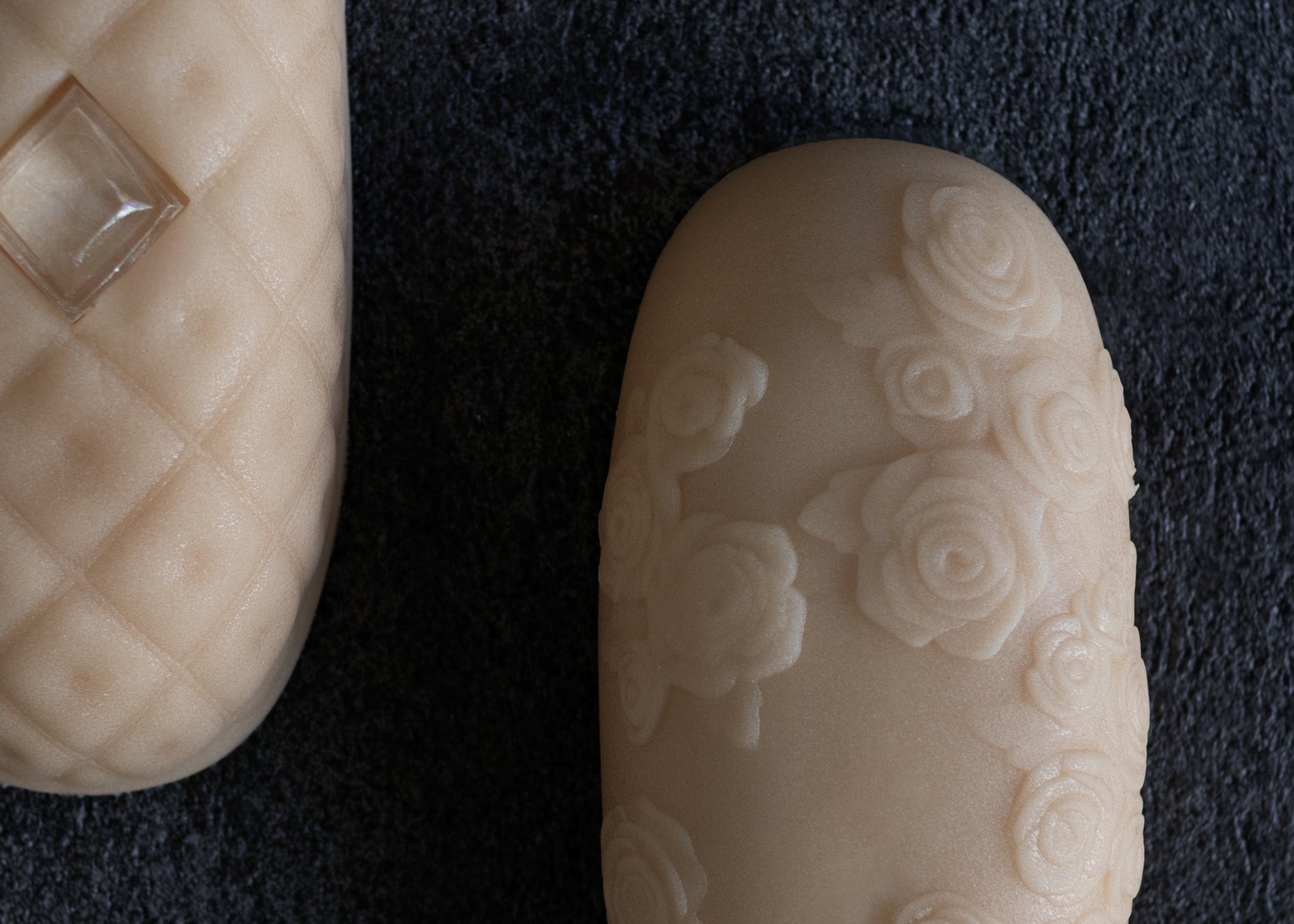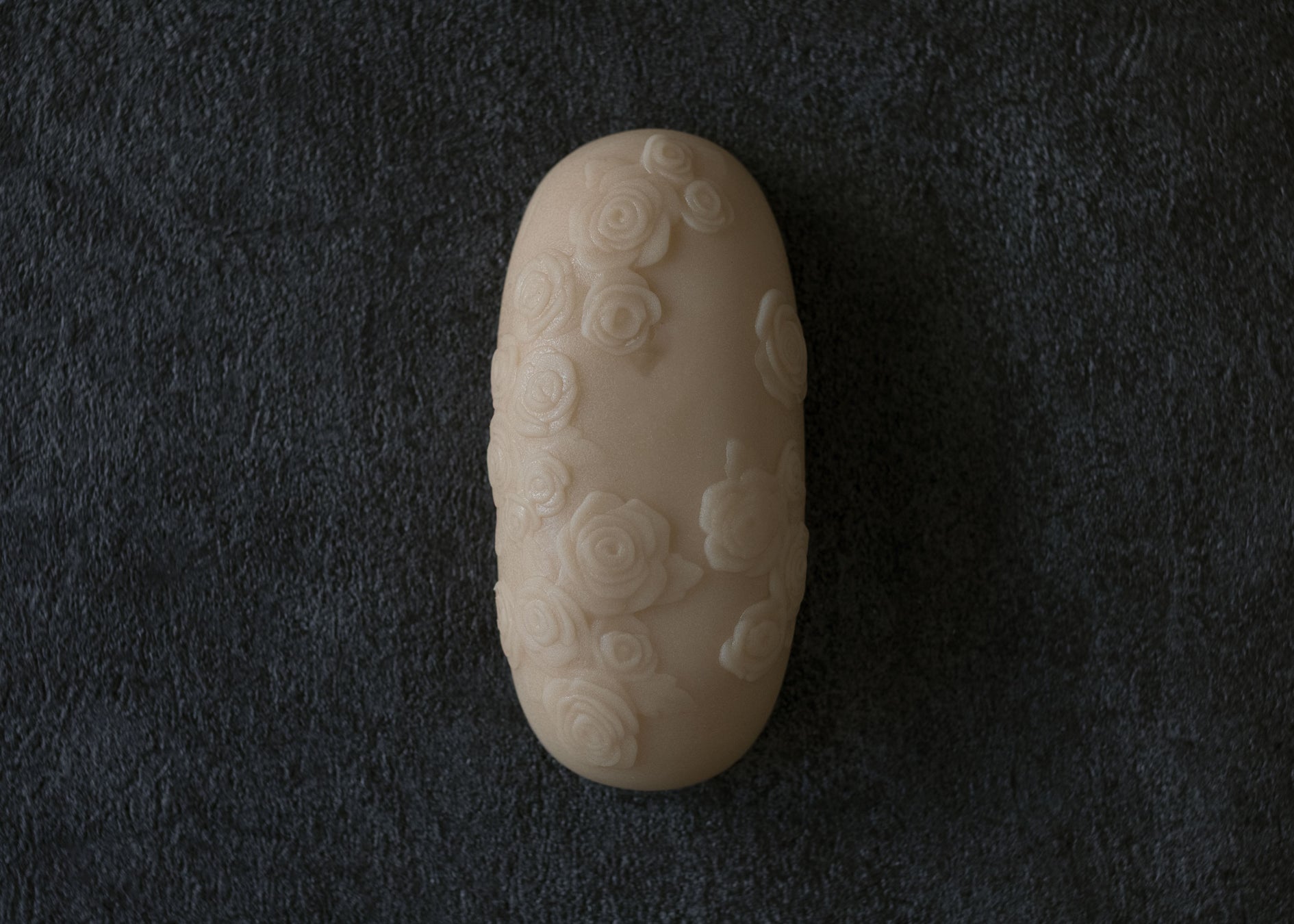 白磁のすべらかな肌理(きめ)を思わせる上品なマット質感を持ち、柔らかな練り切り生地の中に、薔薇文様を象嵌(ぞうがん)技法で浮かび上がらせ、文様構成が静かに沈み込む陰影の美を際立たせ、最も華やかで彫刻的な表情が際立つモデル。その一線を画す美術性は、触れた瞬間に美術品として繊細ながら力強い存在感を立ち上がらせます。