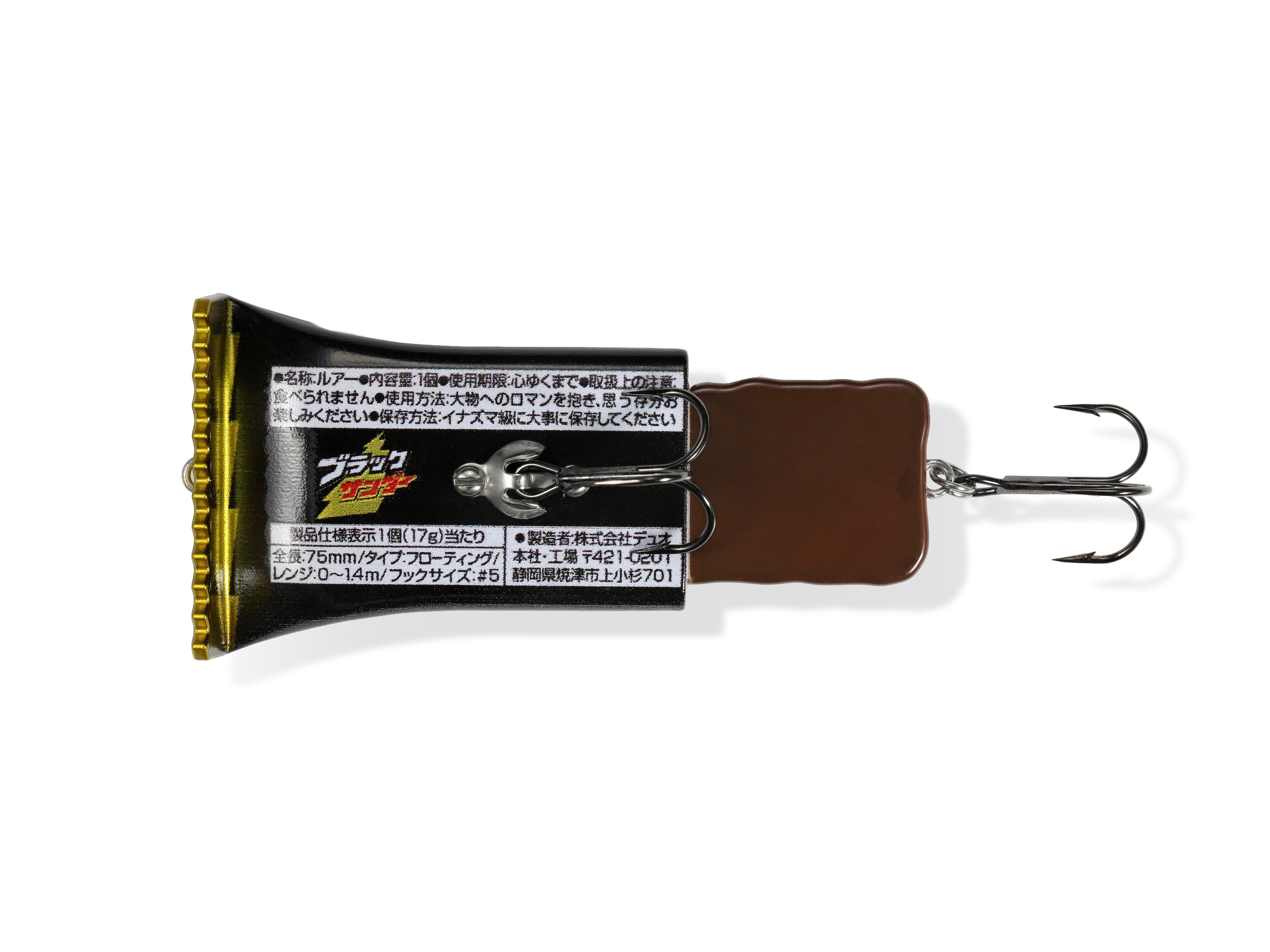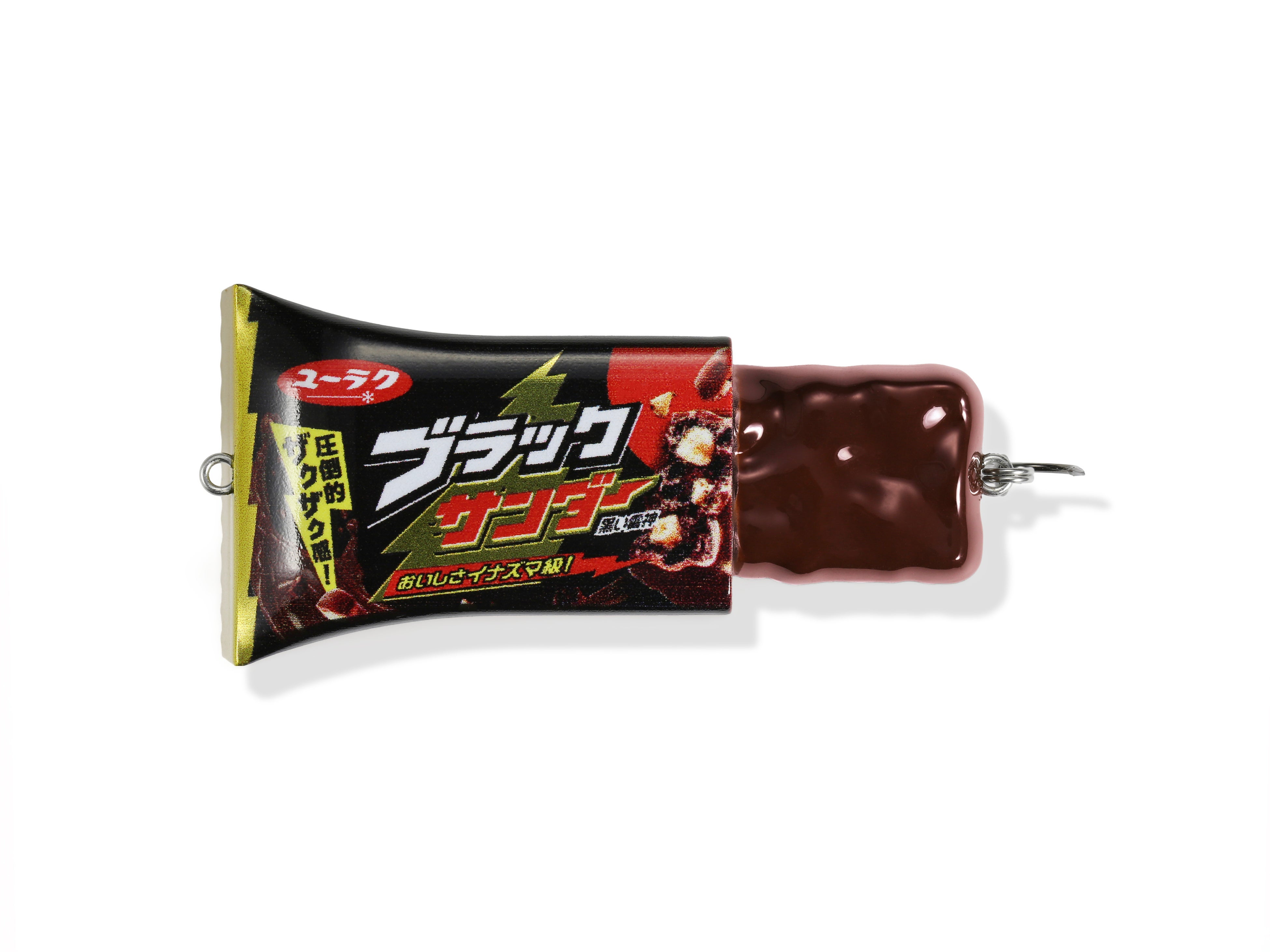 今回の「ブラックサンダールアー」は、その「BACKDOOR PROJECT」第3弾として登場。有楽製菓の象徴であるブラックサンダーのデザインを、素材の質感やフォルムに至るまで忠実に再現しながら、ルアーとしての機能性を追求した特別仕様です。実際に魚が釣れた際にはまるで魚がブラックサンダーを食べているようにも見えるユニークなルアーで「イナズマ級に刺激的な釣り」をご体感ください。