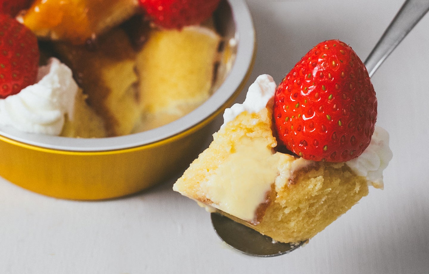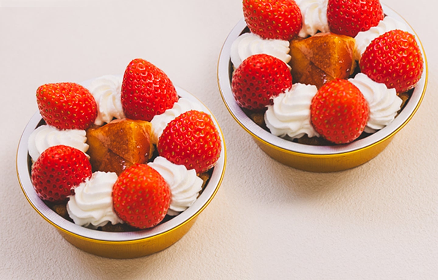 スプーンを入れると、バームクーヘンの層をなす生地がやわらかく沈み、底にはなめらかなプリンが静かに隠れています。表面は香ばしくキャラメリゼ。白十字自社農園で栽培した甘酸っぱい苺とフレッシュな生クリームが重なり、ひと口ごとに香ばしさ・甘さ・爽やかさがほどける。