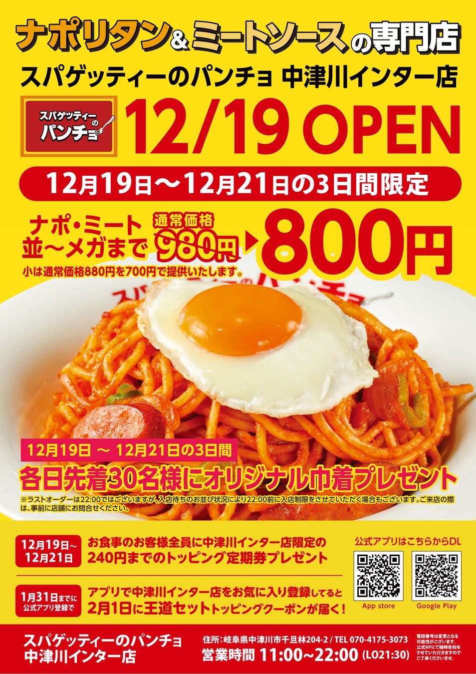 “改めてナポリタンはうまいと言わせたい”を理念に掲げるスパゲッティーのパンチョ(運営会社:株式会社パンチョ、本社:東京都武蔵野市、CEO:野尻圭介)は、2025年12月19(金)に「スパゲッティーのパンチョ 中津川インター店」を新規開店します。
