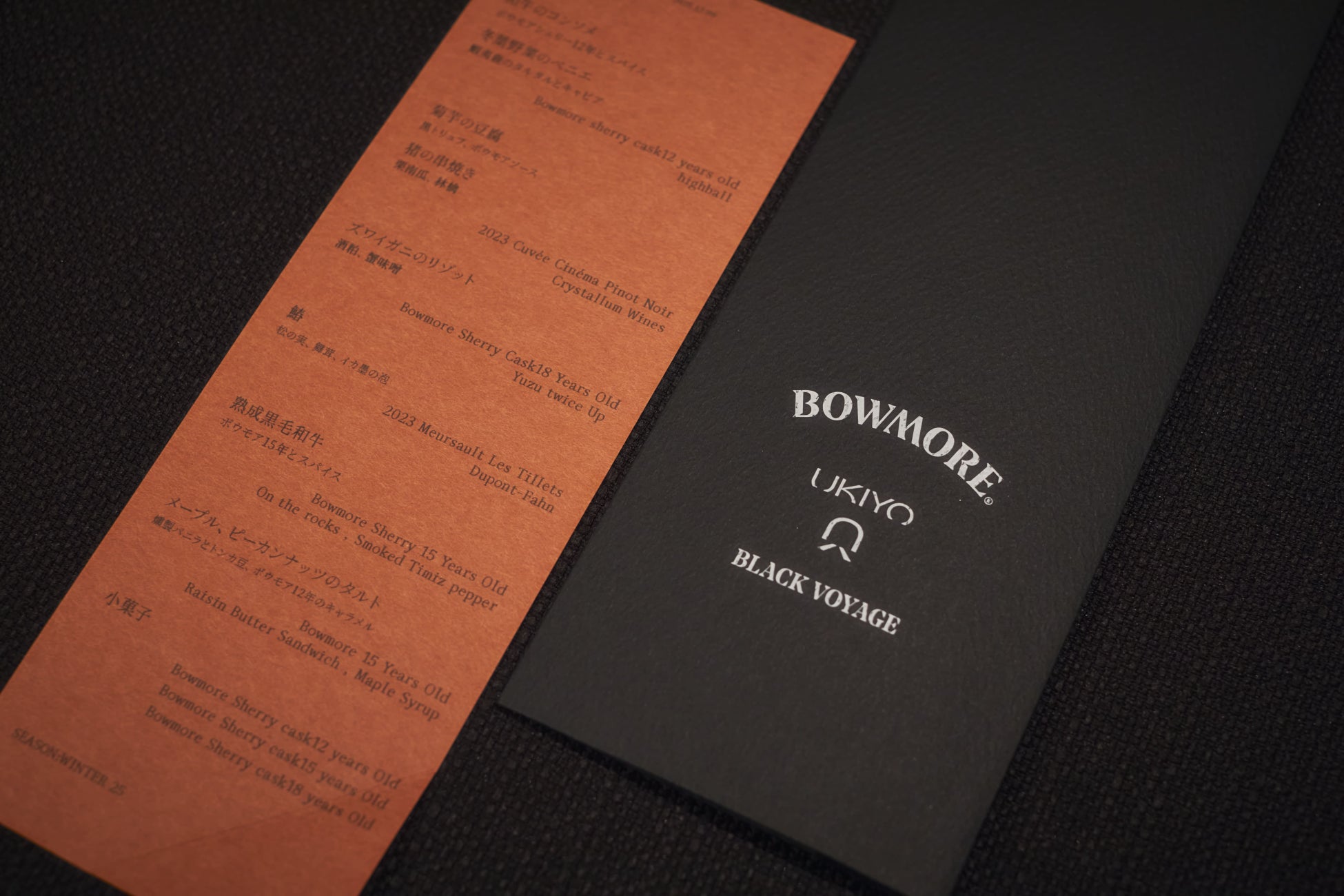 サントリー株式会社は、スコットランドのシングルモルトウイスキー 「ボウモア(BOWMORE)」 ブランドのリニューアルを記念し、代々木上原で注目を集めるガストロノミー「Ukiyo」にて、ペアリングランチイベント「BOWMORE BLACK VOYAGE」を12月9日(火)・10日(水)の2日間にわたり開催しました。
