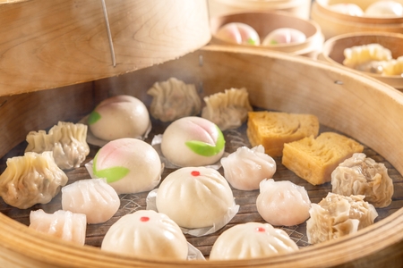 干し貝柱入り焼売/小籠包/海老蒸し餃子/胡麻団子/カスタード寿桃/一口あんまん/馬拉糕(マーラーカオ)