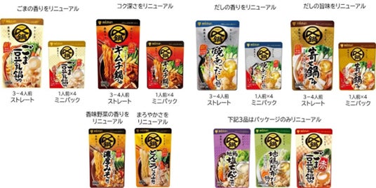 ごま豆乳鍋つゆ・キムチ鍋つゆ・焼あごだし鍋つゆ・寄せ鍋つゆ(ストレート・ミニパックともに)、濃厚みそ鍋つゆ、