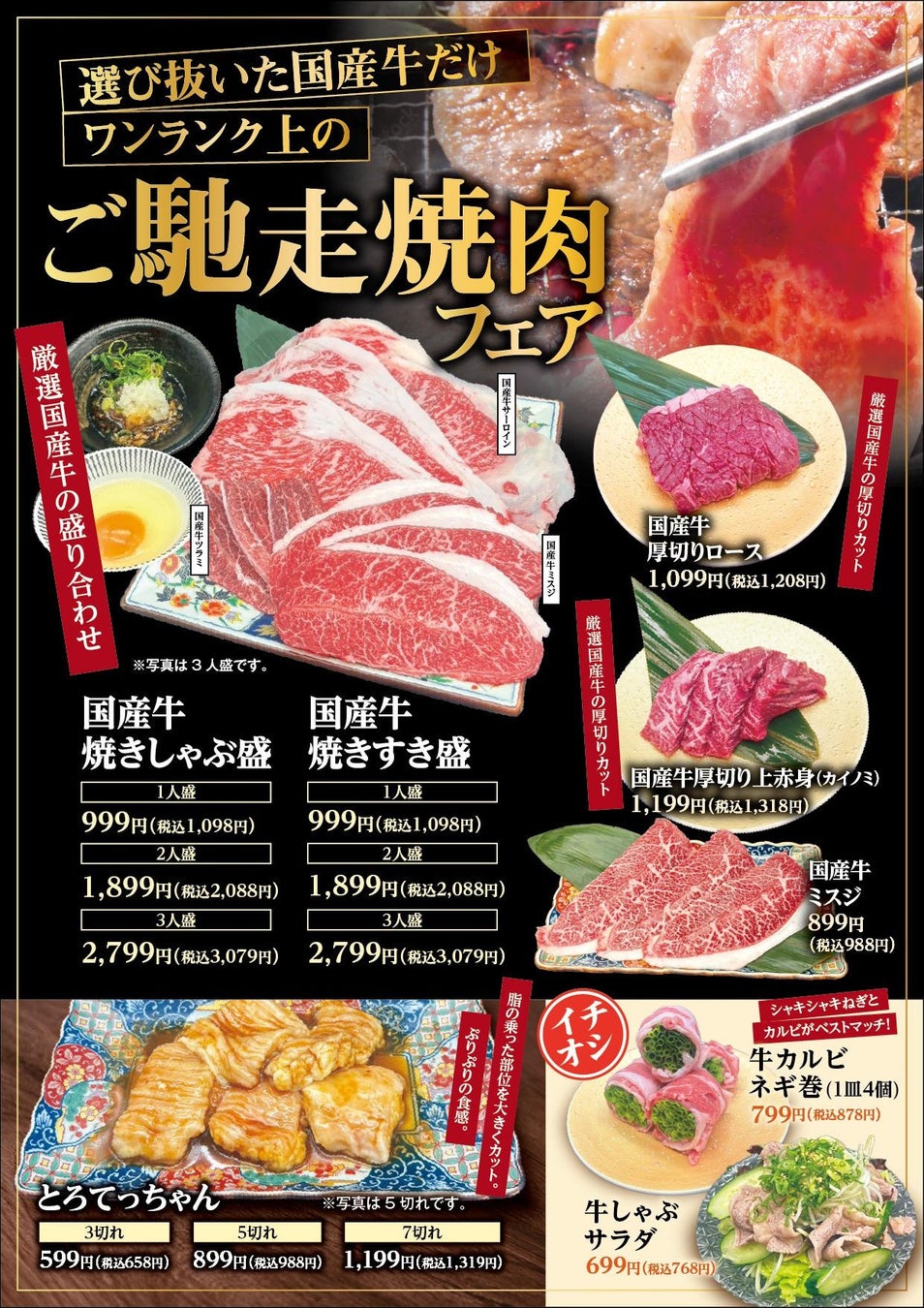 選び抜いた国産牛のみを使用したワンランク上のご馳走焼肉フェアで、厳選国産牛の盛り合わせや国産牛の厚切りカットなどをご用意しています。