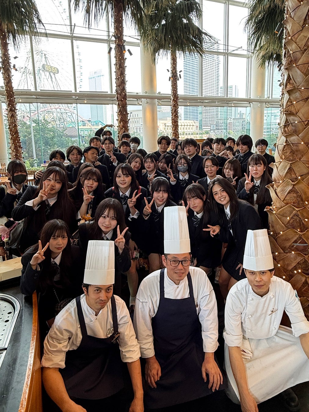 カフェトスカ店内にて、生徒の皆さんとシェフとの集合写真