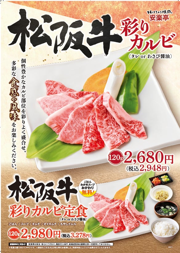 日本三大和牛のひとつとされる松阪牛を、安楽亭でお召し上がりいただけるこの機会。しっかりお肉に向き合ってきた安楽亭だからできる「身近な贅沢」を是非体験してみてください!