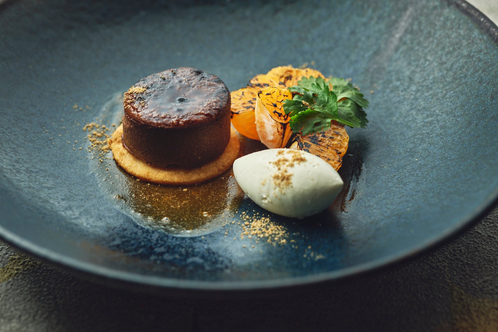 濃厚なショコラとフロマージュに、みかんの酸味とコリアンダーの爽快感をアクセントに添えた大人のデザートでコースを締めくくります。