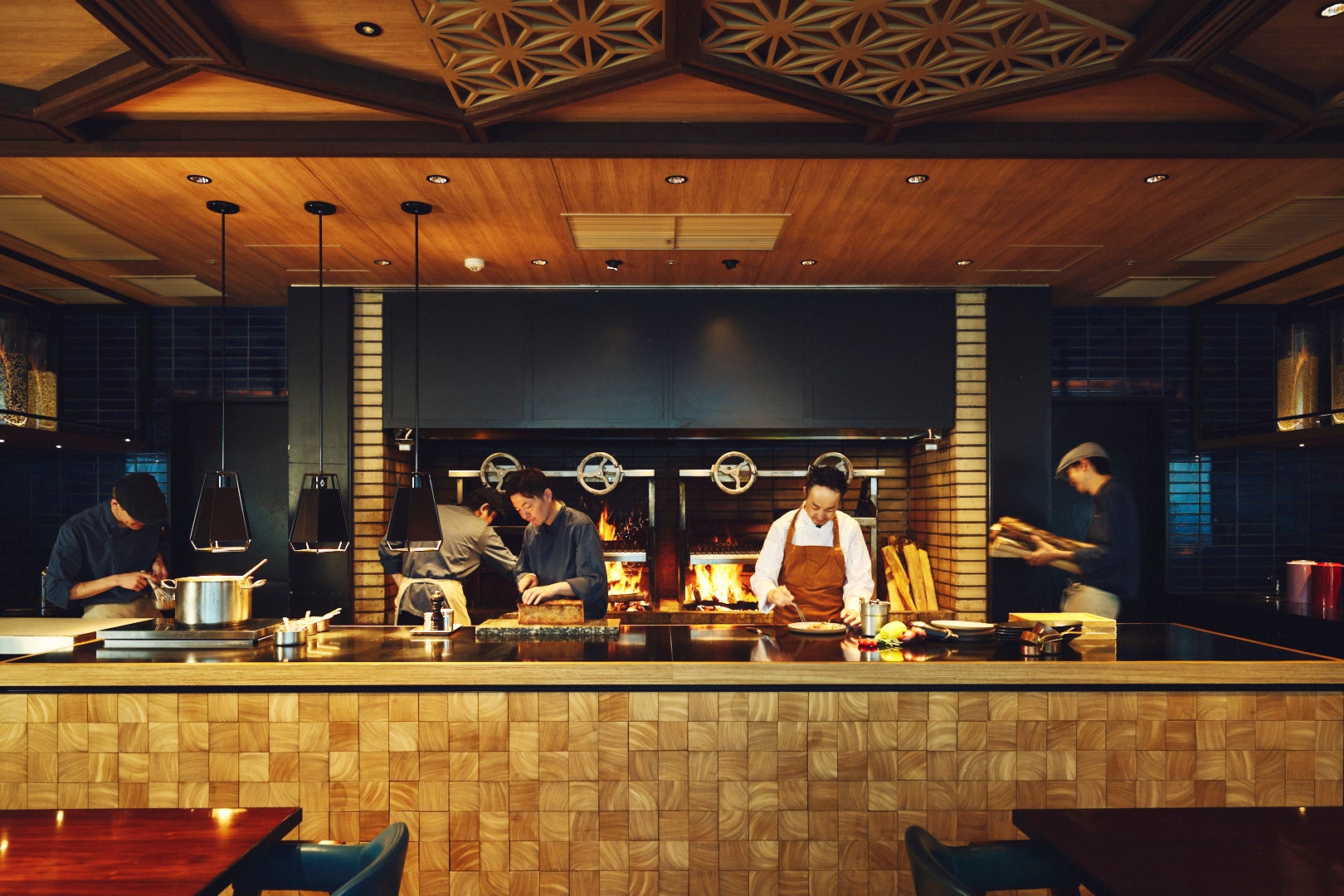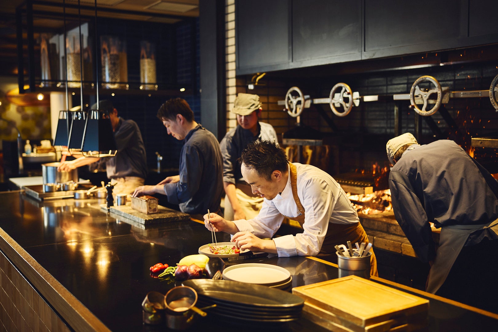 レストラン「リバーサイドキッチン&バー」では、シェフがダイニングの中央で巧みに炎を舞わせ、豪快なグリル料理の数々を提供します。その薪火料理には間伐材のヒノキや楢の木を使用し、そこから放たれる燻煙が肉や魚に深い風味を添えます。この特別な調理法により、肉のうまみが最大限に引き出され、贅沢な一皿が生まれます。