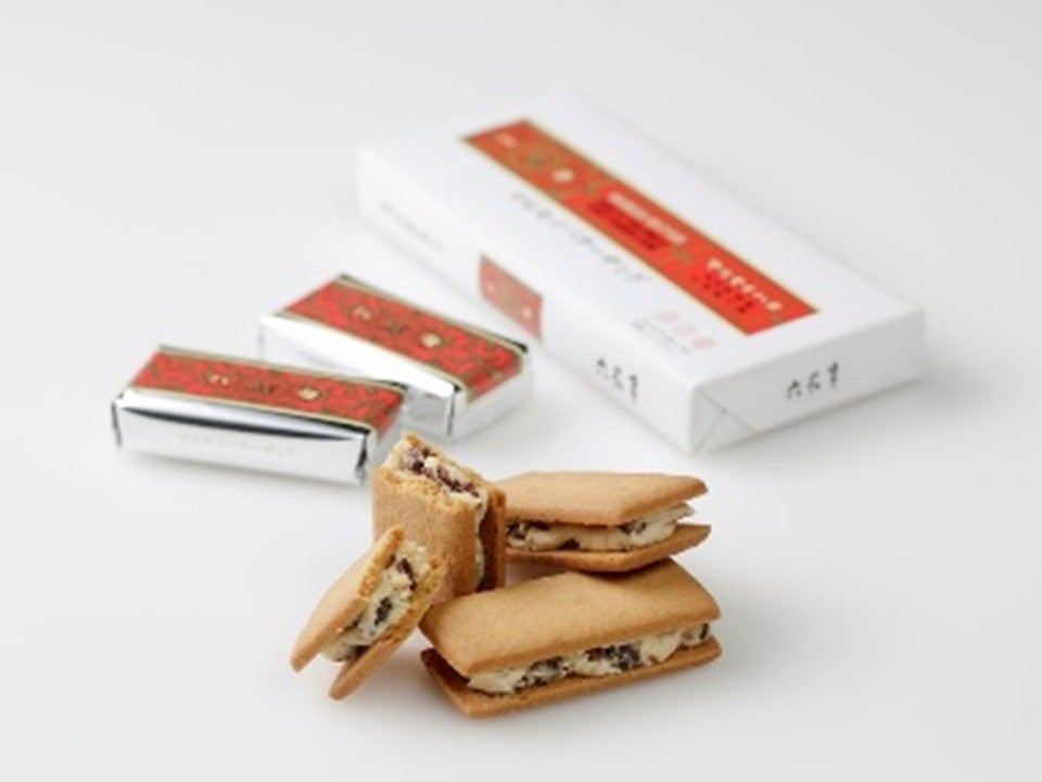 ホワイトチョコレートと北海道産生乳100%のバター、そしてカリフォルニア産のレーズンをあわせたクリームをビスケットでサンドした、ロングセラー商品。
