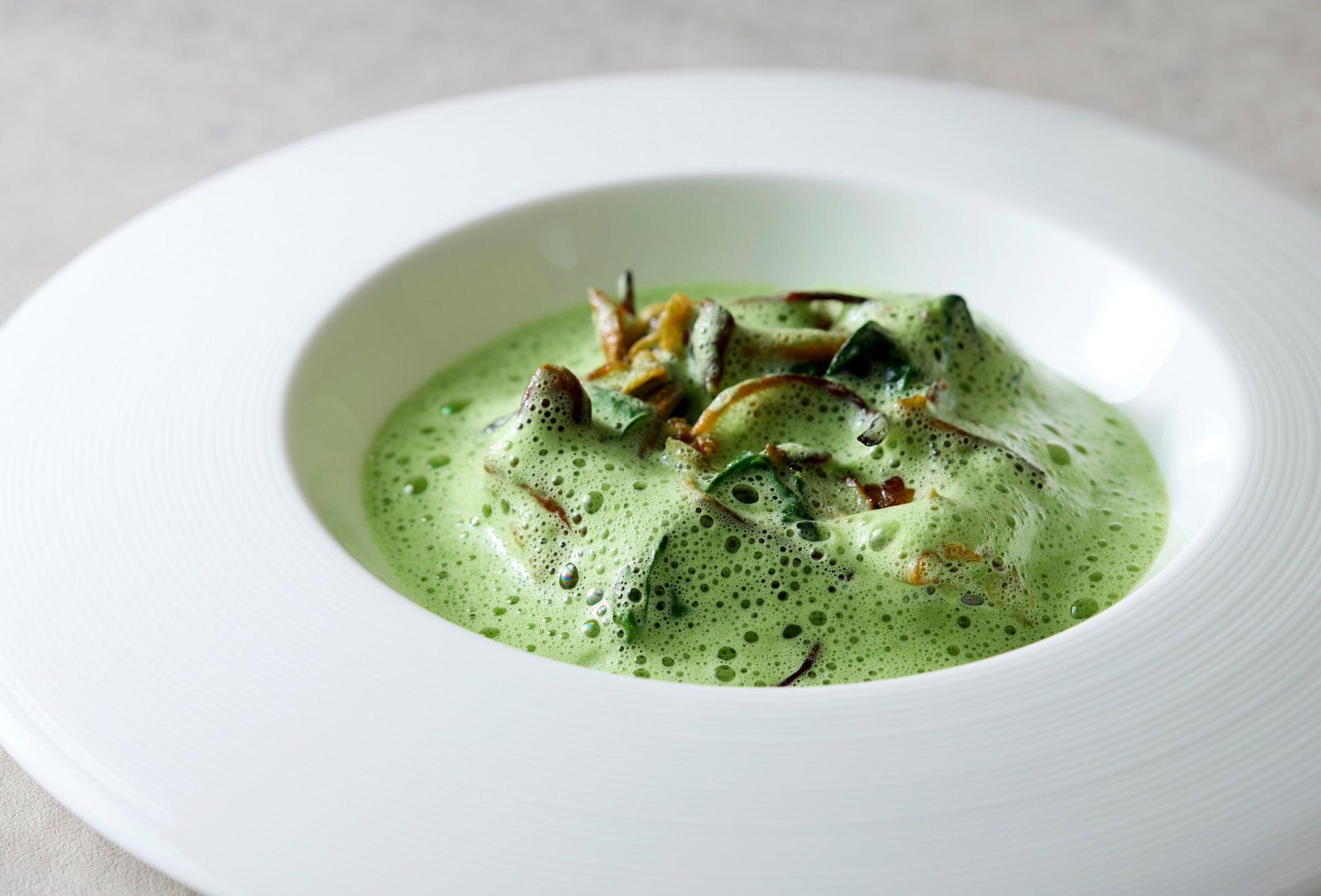 コースはTHE RAYのシグネチャーメニューである清水焼天目碗のスープから始まり、前菜には、柑橘や三つ葉をアクセントにした春の息吹を思わせる真鯛のマリネを。メインは、千切りじゃが芋を揚げたフランスの伝統料理「パイヤソン」を、魚と新じゃが芋でアレンジしたひと皿。軽やかな泡のソースが香りを引き立てます。スイーツとともに、コース仕立てで贅沢にお楽しみいただけます。