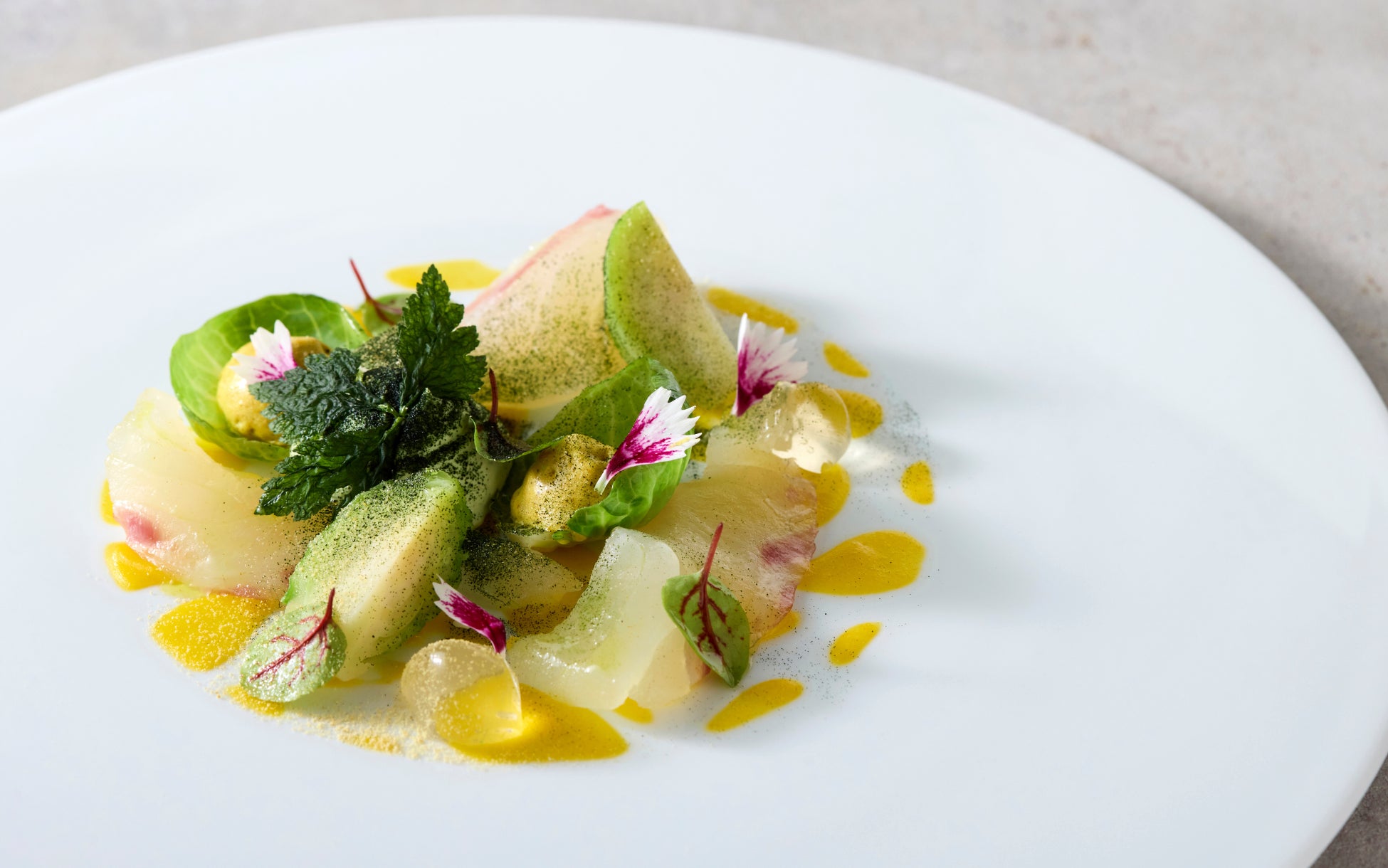 前菜「真鯛のマリネ 柑橘のピュレとプードル ビネガージュレと三つ葉のアクセント」