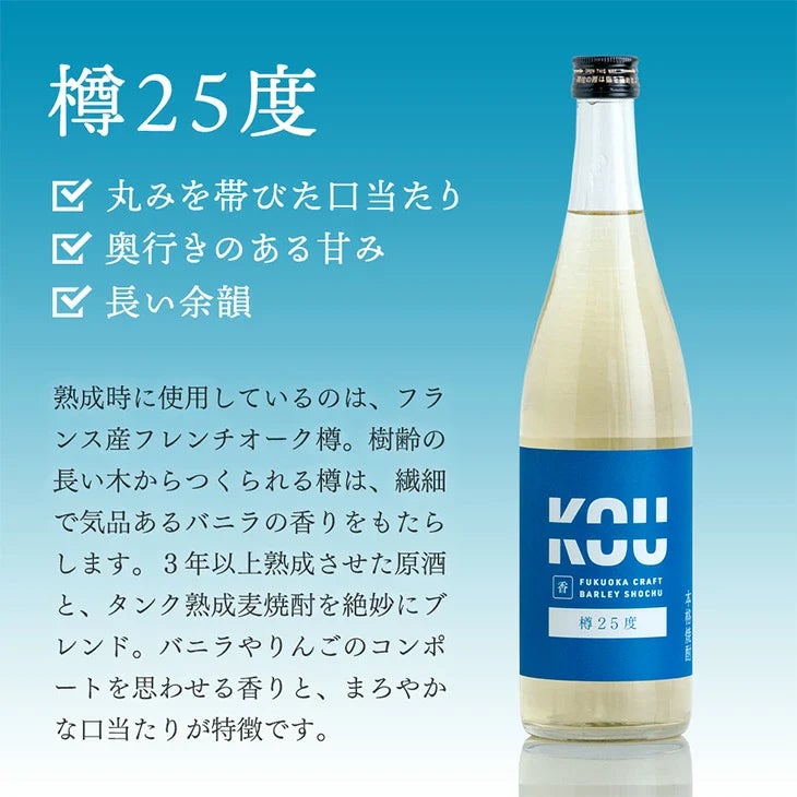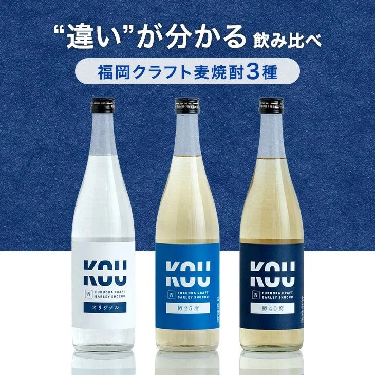 福岡県は日本酒文化が発展した土地であり、その吟醸技術を応用することで、香り豊かで繊細な麦焼酎が生まれています。「KOU-ICHI」は、福岡焼酎の魅力をしっかり味わってもらうことを目的にしっかり飲み比べを楽しめるセットとして開発しました。