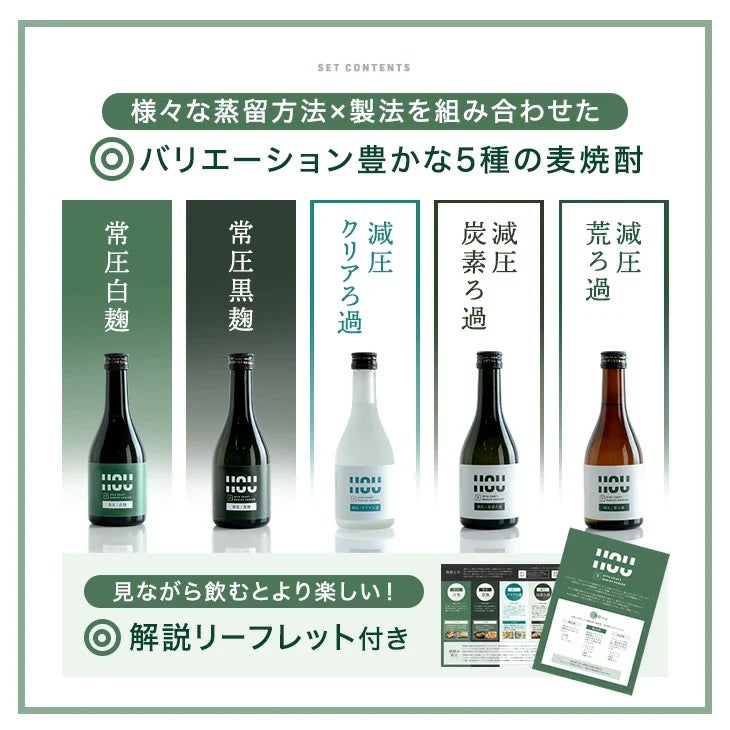 蒸留方法や熟成の違いによって生まれる麦焼酎の幅広い個性を体験できる 300ml × 5本セット