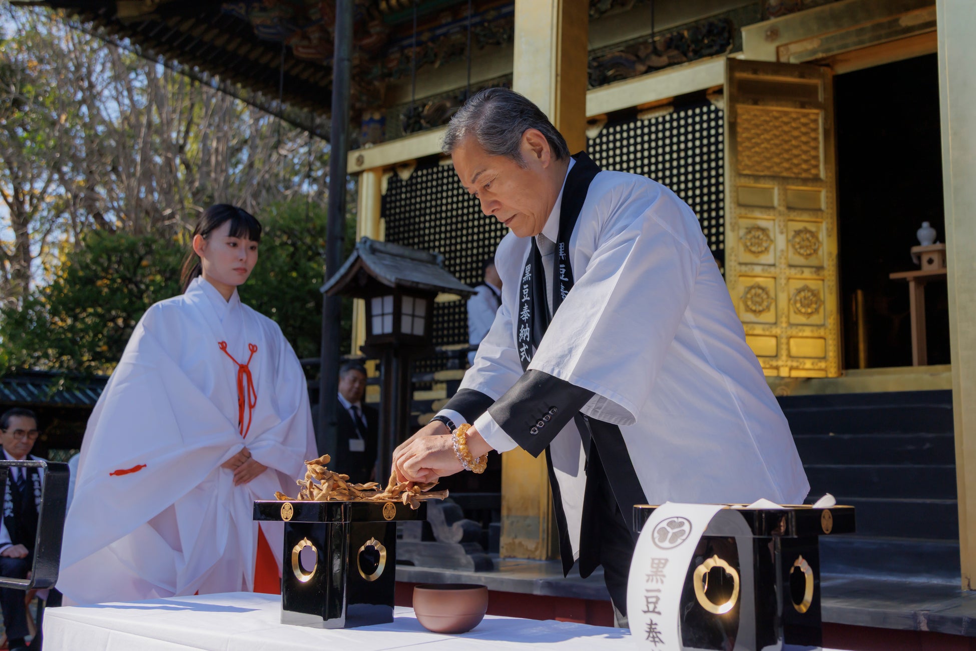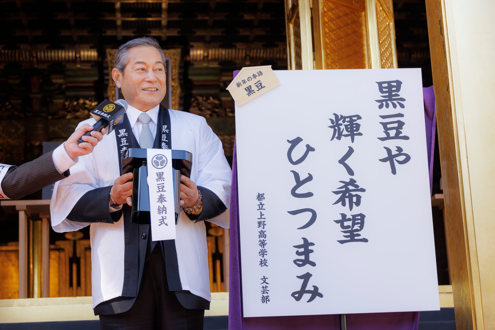 また、松平健氏には、和食作法を学ぶ「黒豆つかみゲーム」に参加いただきました。一昨年は27 粒、昨年は31 粒の記録でしたが、本年は寒さが厳しく手がかじかんでしまったこともあり24 粒の結果となりました。その後「黒豆のふるまい」を、松平健氏から上野東照宮のご参拝者に直接お渡しいただきました。実際に松平健氏からふるまいを受けた方からは「松平さんとお会いできて嬉しかった。元気がでた」と喜びの声も聞こえました。