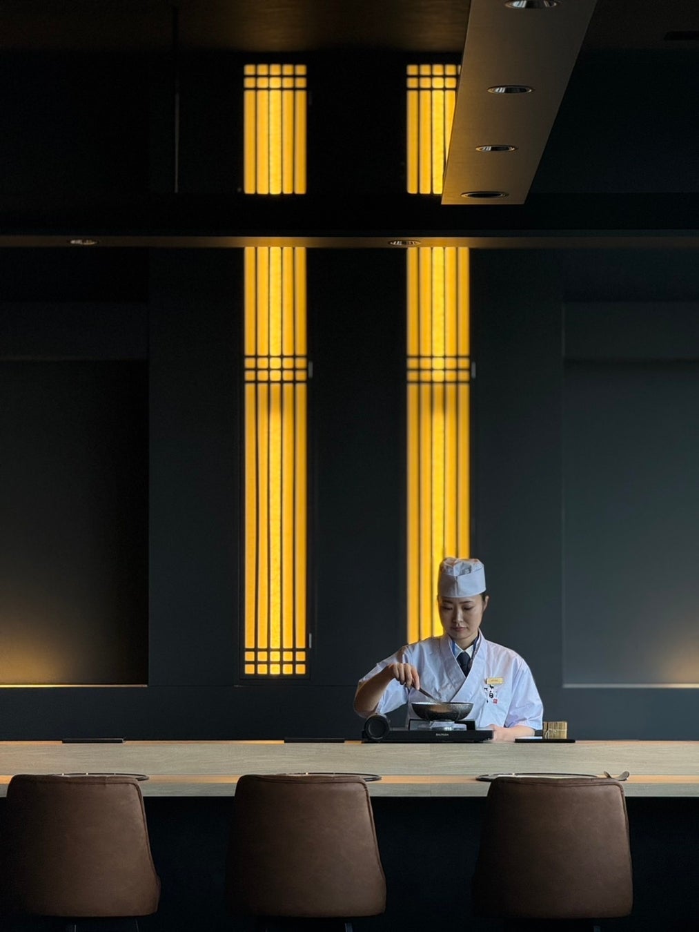 6階からの眺望を生かした大きな窓沿いにL字のカウンターを配し、景色と職人の所作を一体で味わえる設えとしています。席間にはゆとりを持たせ、空間に“余白”を残すことで、お食事のひとときをより快適にお過ごしいただけるよう整えています。