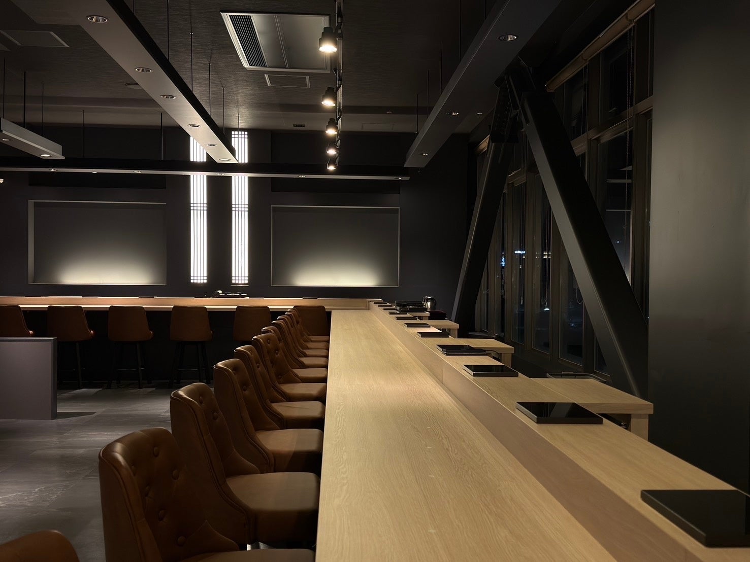 店内は、シックなデザインで高級感あふれる空間設計。6階からの景色が一望できるよう、窓際に大きな寿司カウンターを設けております。