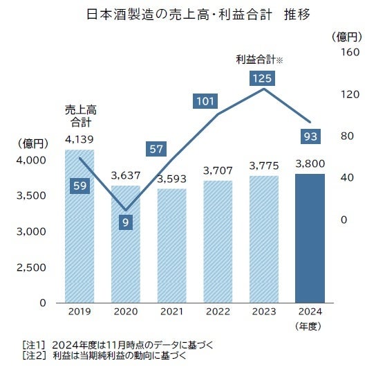 全国の「日本酒製造」を主業とする企業(蔵元)約1000社における、2024年度の売上高合計は約3800億円となった。前年度の3775億円を0.7%上回り、3年連続で増加したほか、コロナ禍で大幅に需要が落ち込んだ2020年度以降の5年間で最高を更新した。他方で、2024年度の利益合計は93億円にとどまり、100億円を超えた前年度(125億円)から25.6%減少した。日本酒の知名度向上を背景に、海外からの訪日客を中心に売り上げが伸びた半面、原料米の高騰が経営を直撃したことで、利益が大幅に減少した。
