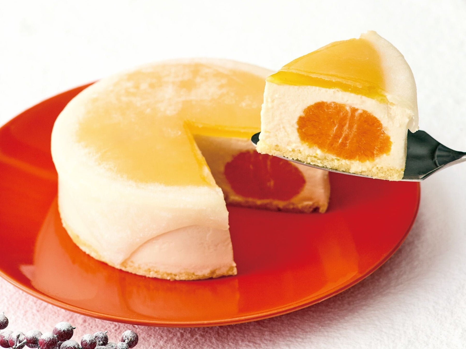 北海道産クリームチーズを使ったチーズムースの中にみかんを丸ごと 5 つ入れた食べ応えがあるケーキに仕上げました。天面には「せとか」を使用したソースを乗せて爽やかな甘みをプラス。その上からもちもちとした求肥で優しく包み込み、お正月にぴったりな華やかなケーキに仕立てました。