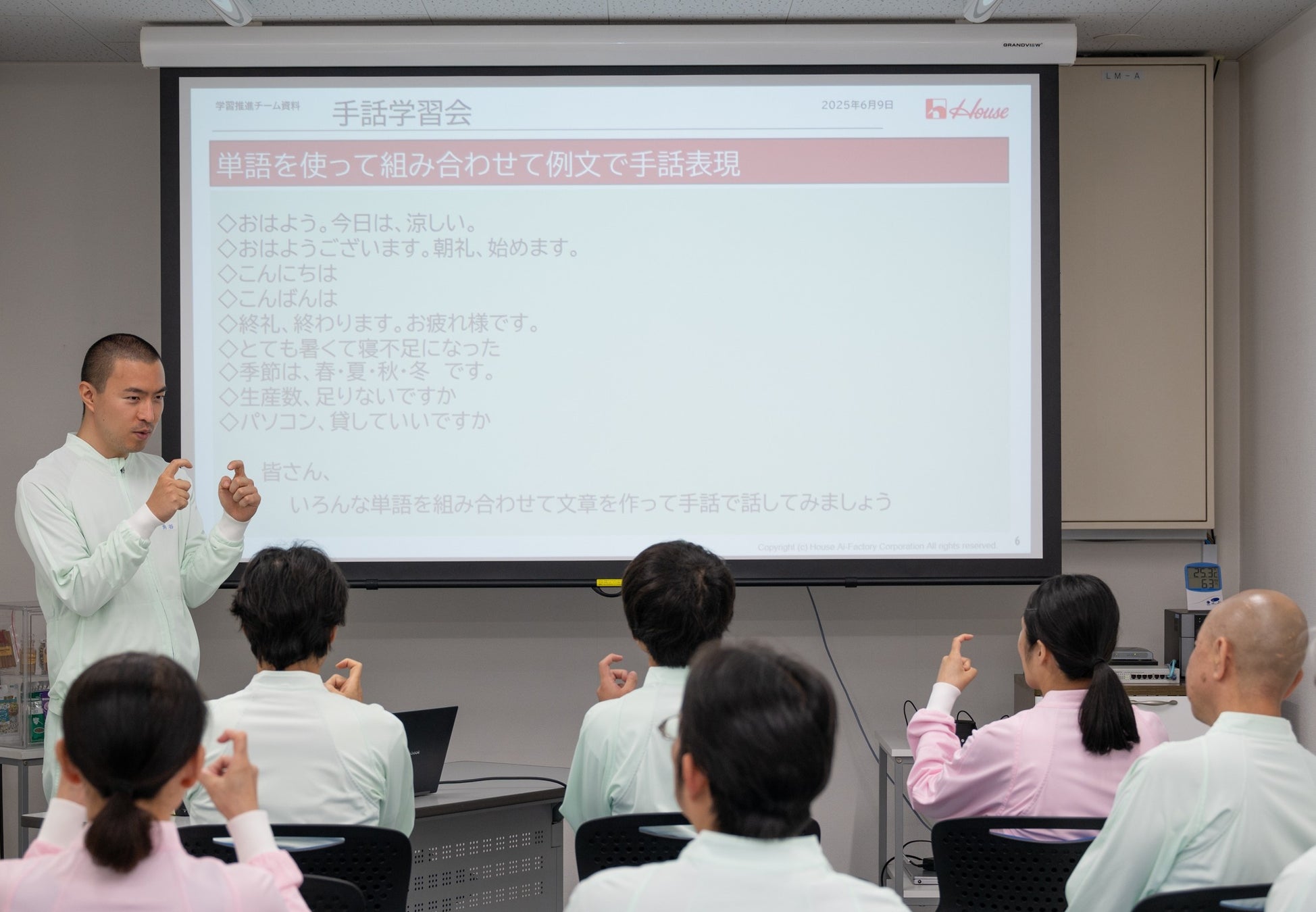 ハウスあいファクトリーでは、聴覚、知的、精神の障がいの種別を問わず、全員が活躍できるよう、新たに入社した障がいのある社員に対して、育成チームで教育訓練を行い、各ライン作業のOJTを繰り返し実施して習得し、その後製造ラインに配置しています。