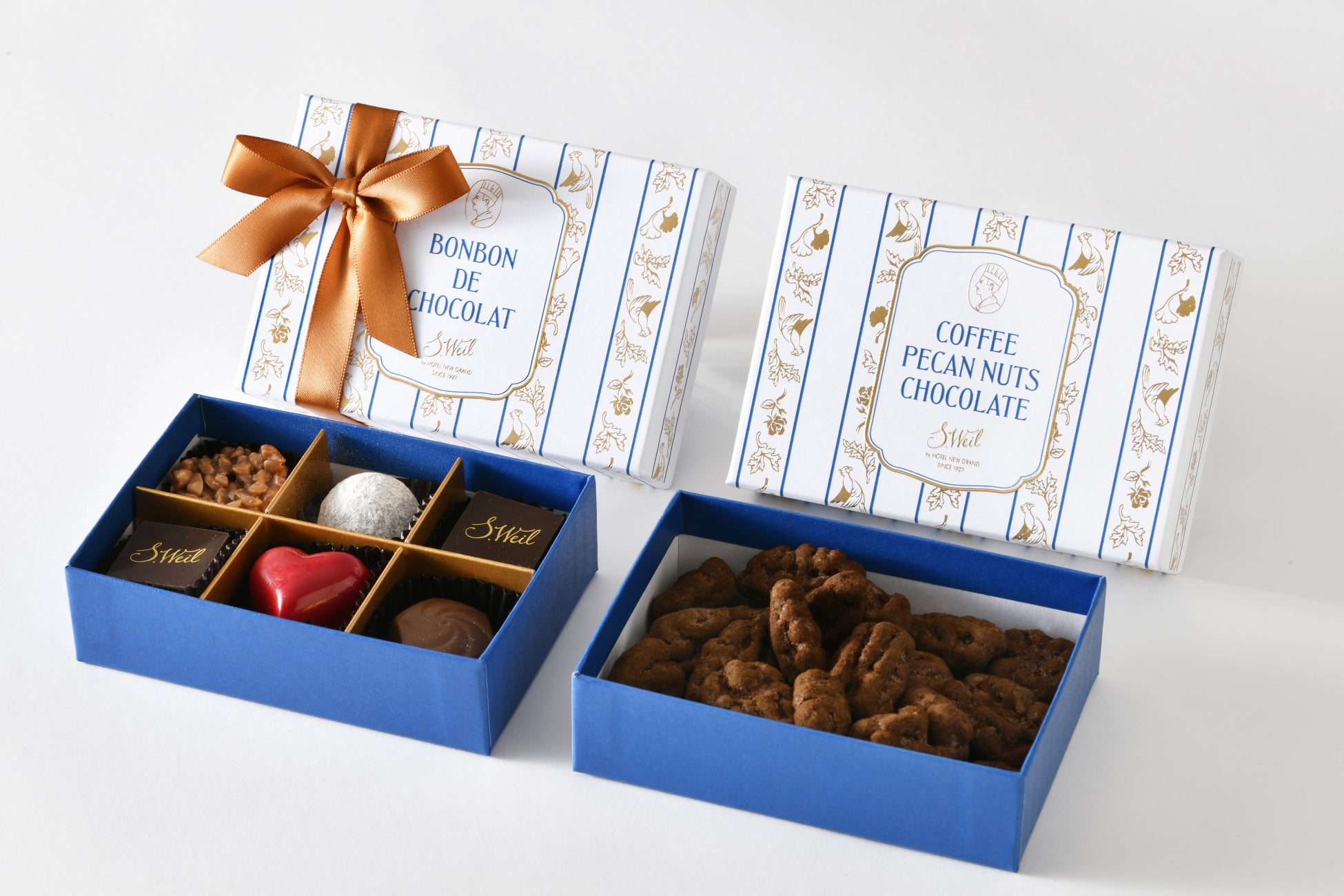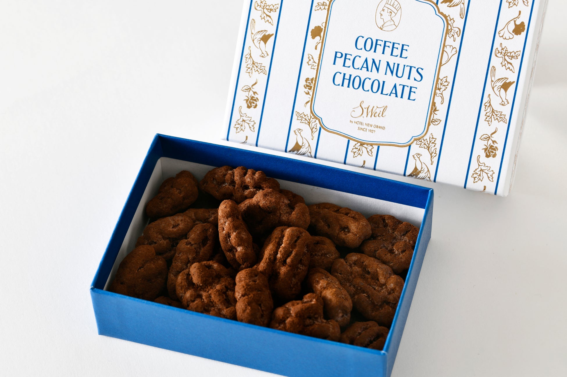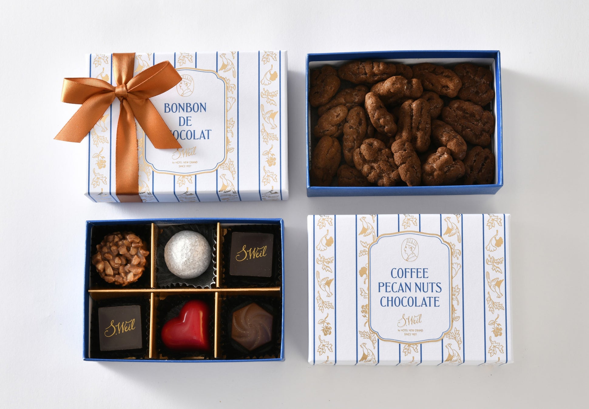 2026年の新作は2品、ベルギー産クーベルチュールチョコレートを使用した「ボンボンショコラ」と「コーヒーペカンナッツショコラ」をご用意しました。「ボンボンショコラ」は、コーヒーや紅茶とのマリアージュをお楽しみいただける5種のフレーバーを詰め合わせました。「コーヒーペカンナッツショコラ」は、S.Weilのオリジナルコーヒー「ザ・コーヒー」のパウダーを纏わせた、香ばしいペカンナッツの食感にほろ苦さとチョコレートの甘さのバランスが絶妙な一品に仕上げました。洗練されたパッケージは、大切な方へのちょっとした贈り物としておすすめです。また、定番人気の「S.Weilコーヒービーンズチョコレート」や「S.Weilコインミルクチョコレート」もご用意しております。S.Weil by HOTEL NEW GRANDのチョコレートコレクションを、この機会にぜひお楽しみください。